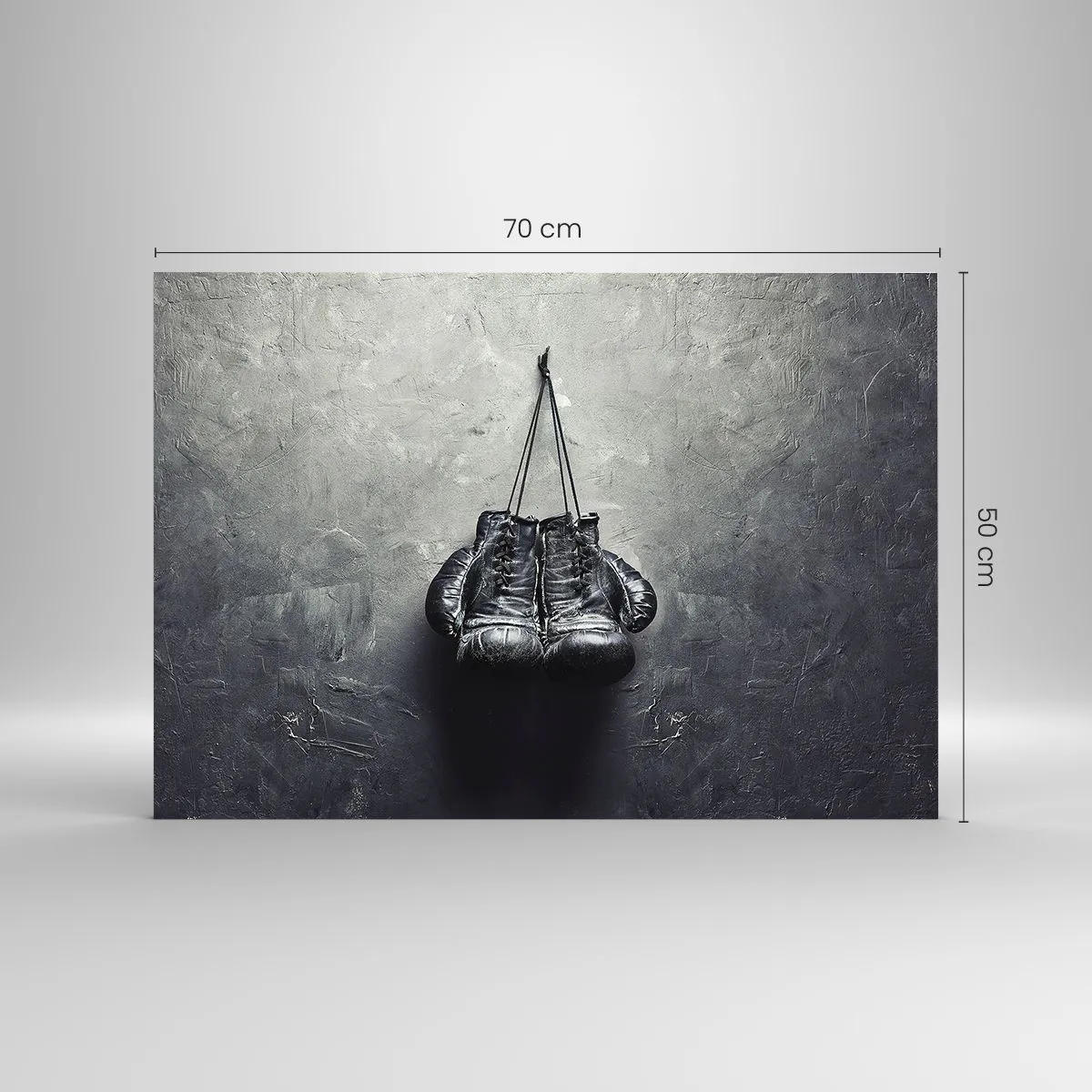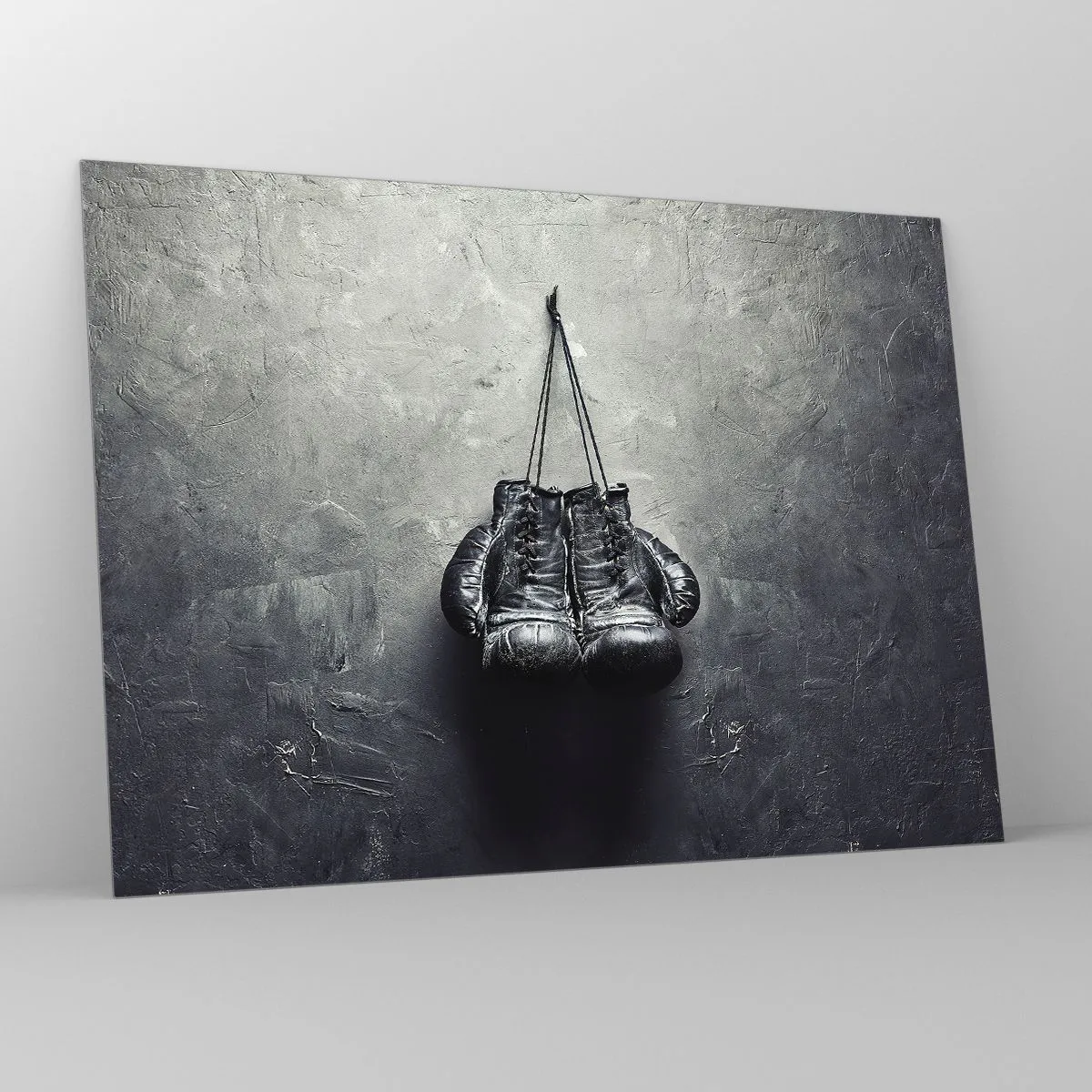 Glasbild - Bild auf glas - Schwarze Boxhandschuhe hängen an der Wand - 70x50cm - Zeit des Kampfes und Zeit des Friedens - Moderne Wanddekoration für Wohnzimmer und Schlafzimmer ARTTOR