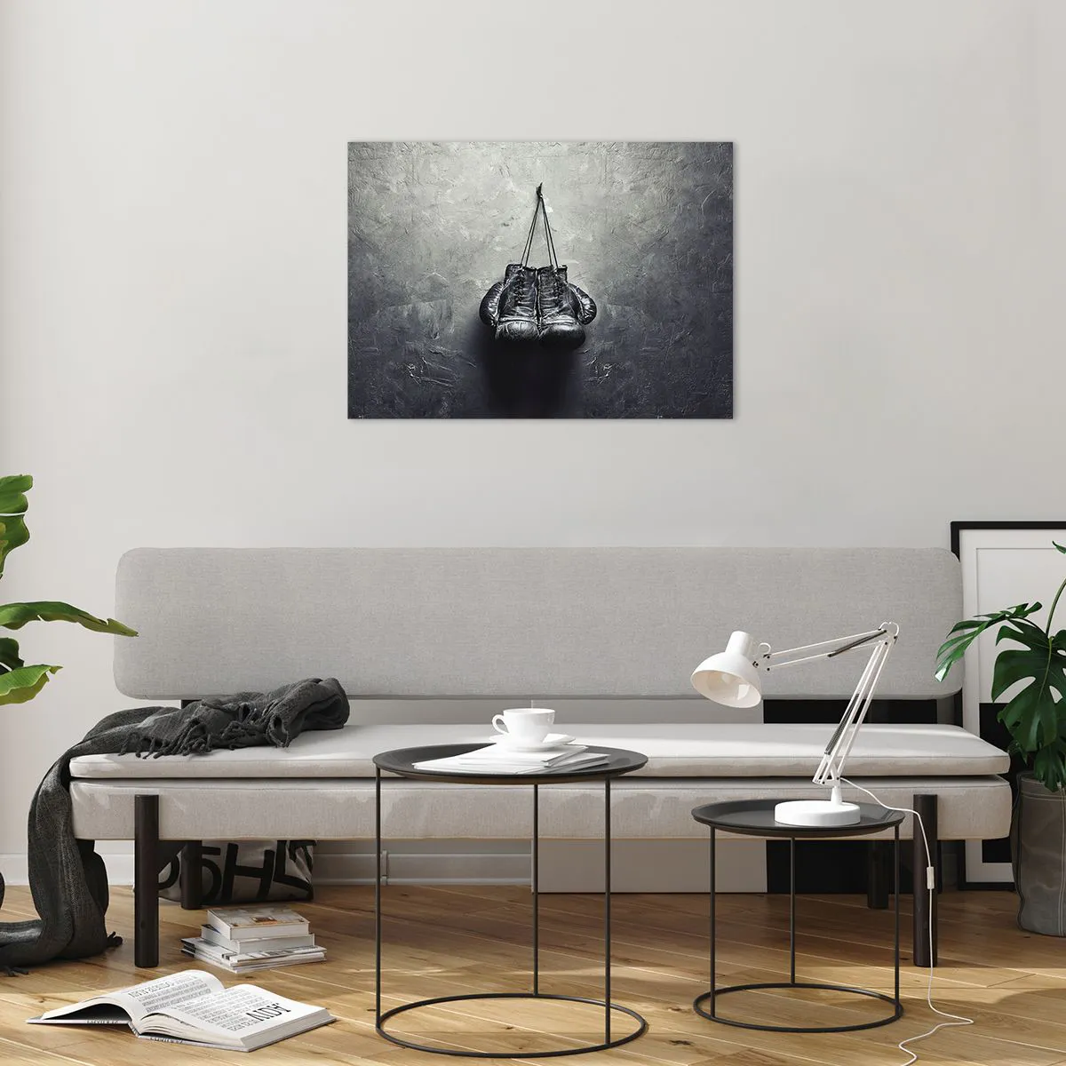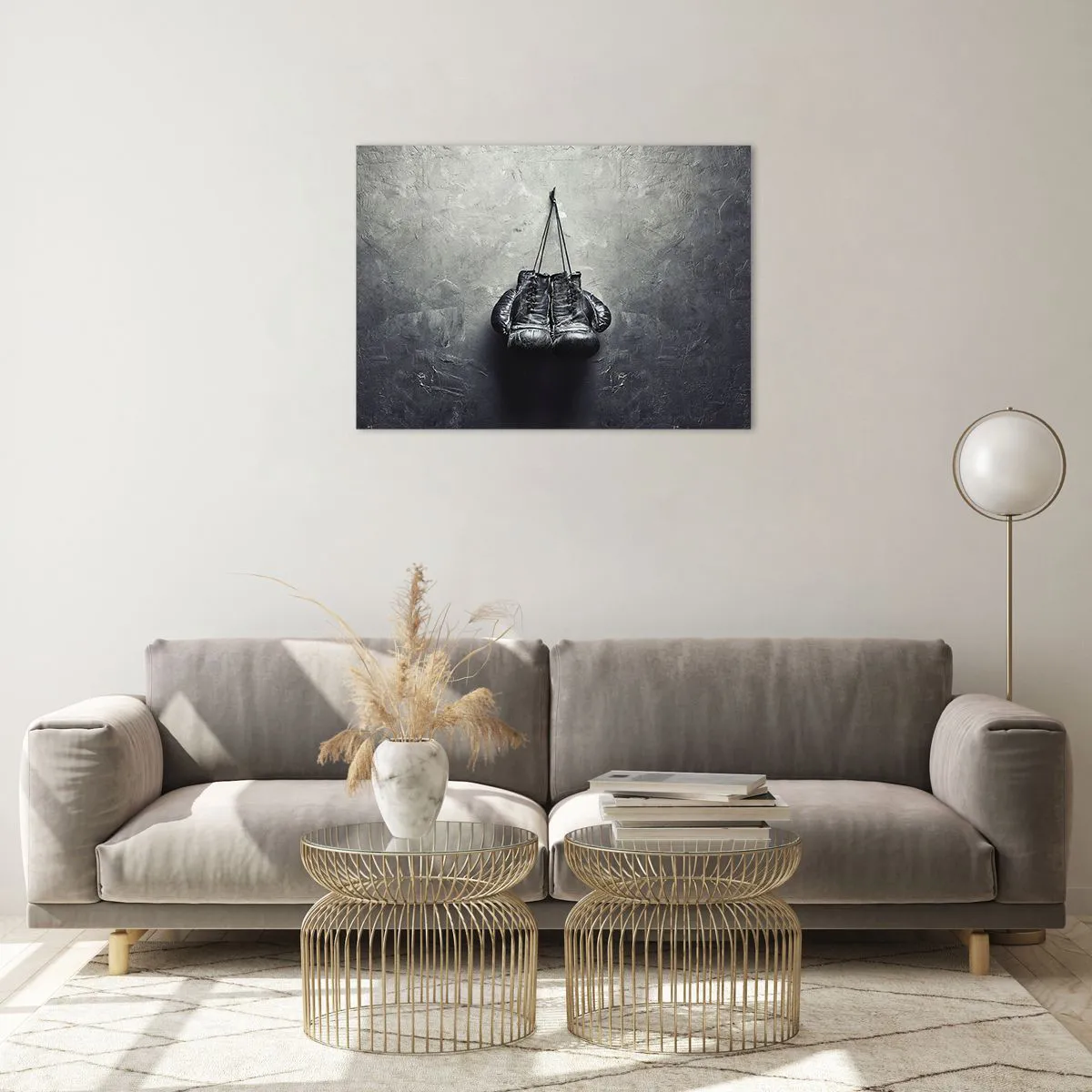 Boxhandschuhe, ein Symbol für Entschlossenheit und Ausdauer, inspirieren zum Handeln und verleihen dem Interieur einen motivierenden Charakter. Die strukturierte Wand bietet einen interessanten Hintergrund und verleiht dem Gemälde einen industriellen Stil und eine einzigartige Ästhetik.