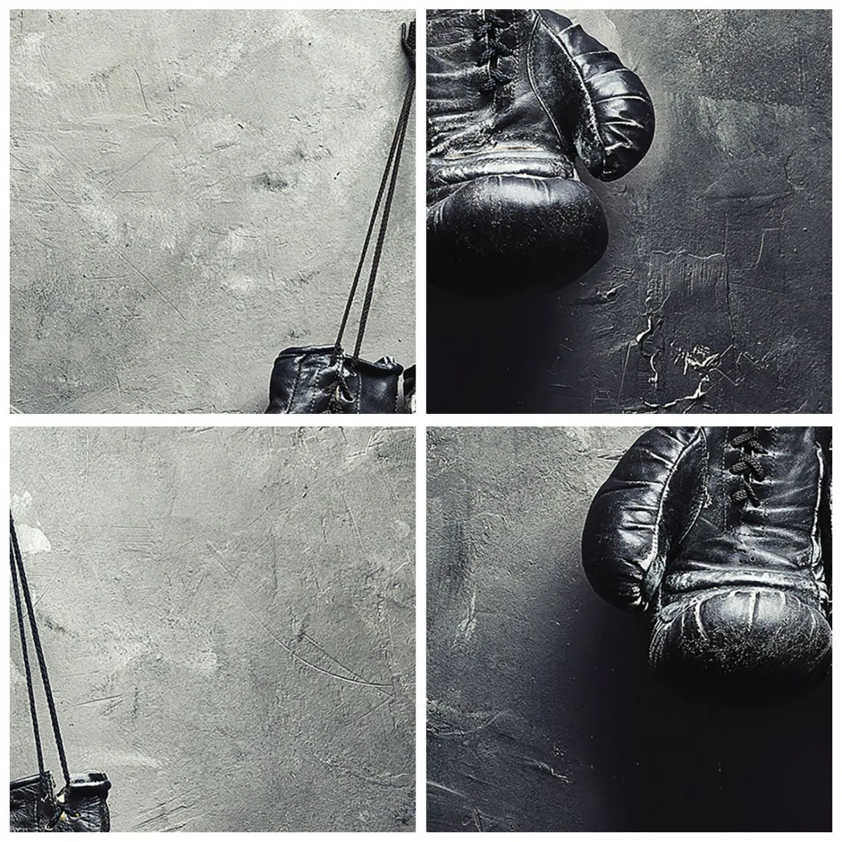 - Schwarze Boxhandschuhe hängen an einer grauen Wand und schaffen eine minimalistische und inspirierende Komposition.