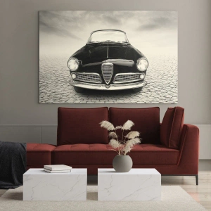 Glasbild - Bild auf glas - Oldtimer auf Kopfsteinpflasterstraße in Schwarz und Weiß - 50x70cm - Man muss mich einfach lieben - Moderne Wanddekoration für Wohnzimmer und Schlafzimmer ARTTOR