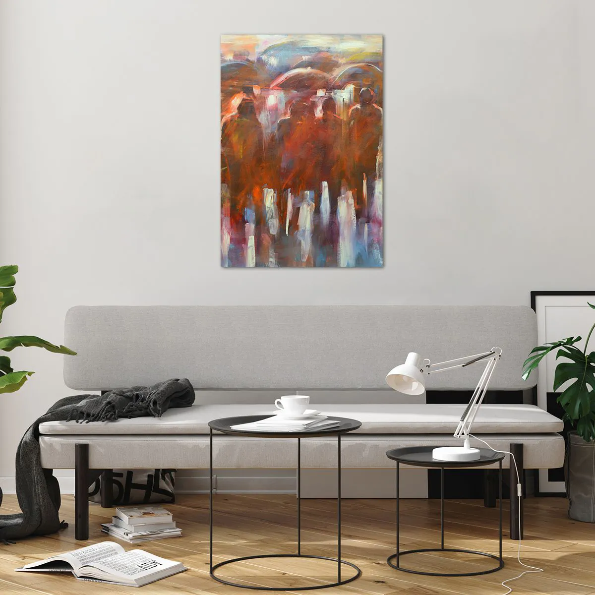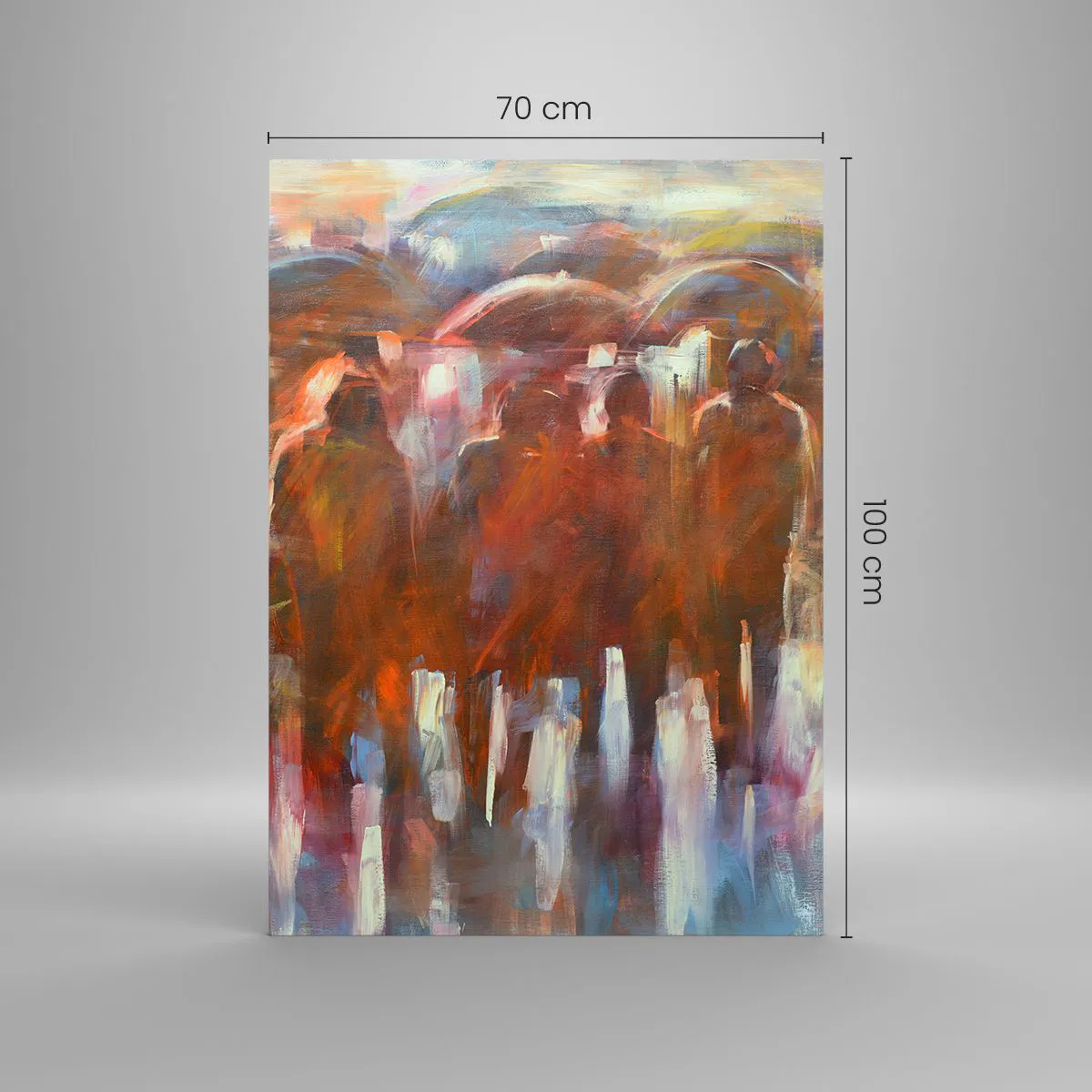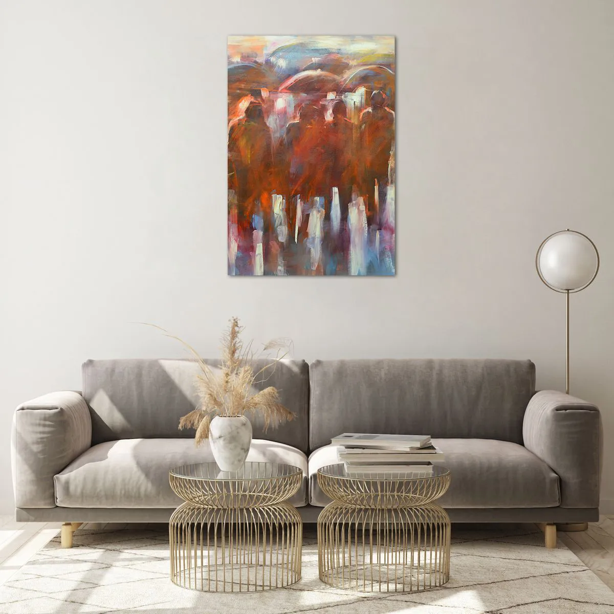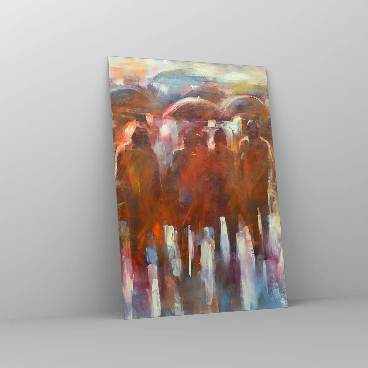 Glasbild - Bild auf glas - Eine Menschenmenge mit Regenschirmen in einer regnerischen, künstlerischen Umgebung - 70x100cm - Auch bei Regen und Nebel - Moderne Wanddekoration für Wohnzimmer und Schlafzimmer ARTTOR