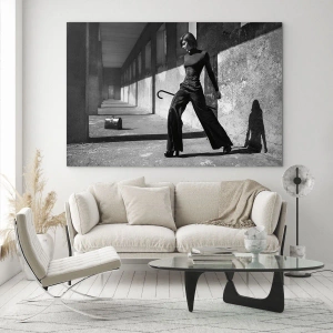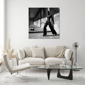 Glasbild - Bild auf glas - Schwarz-Weiß-Fotografie einer Frau in elegantem Outfit in urbaner Umgebung. - 50x70cm - Urbane Eleganz - Moderne Wanddekoration für Wohnzimmer und Schlafzimmer ARTTOR