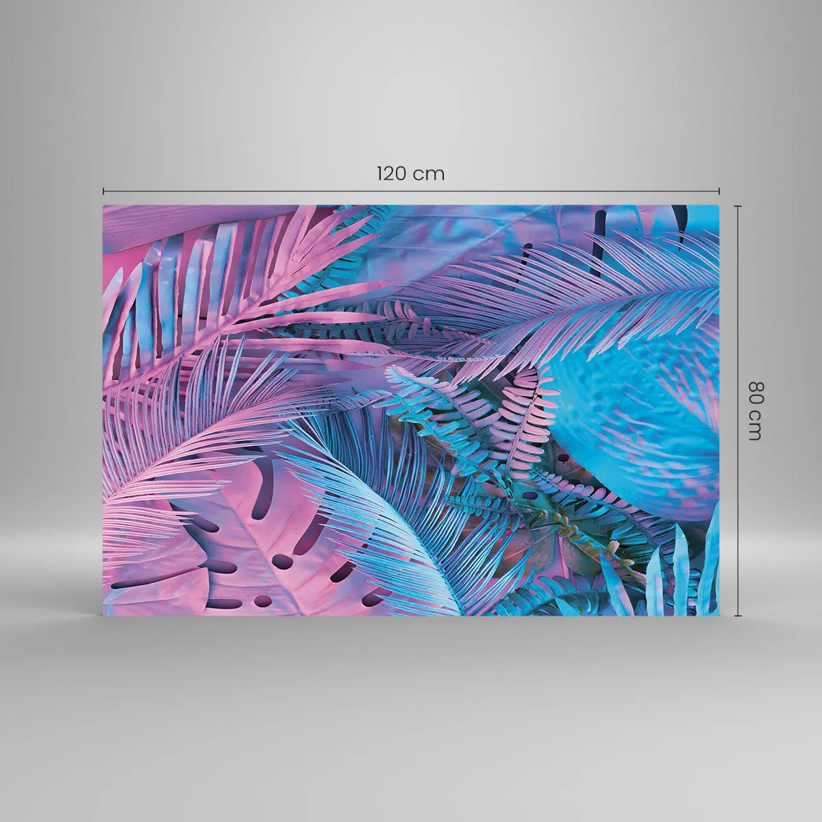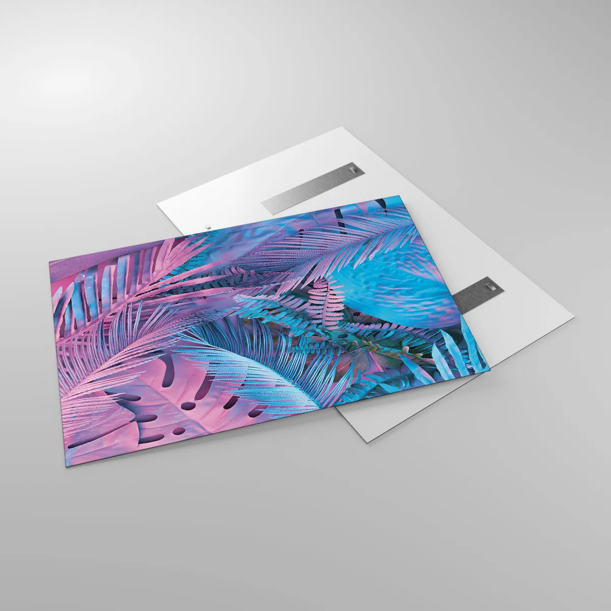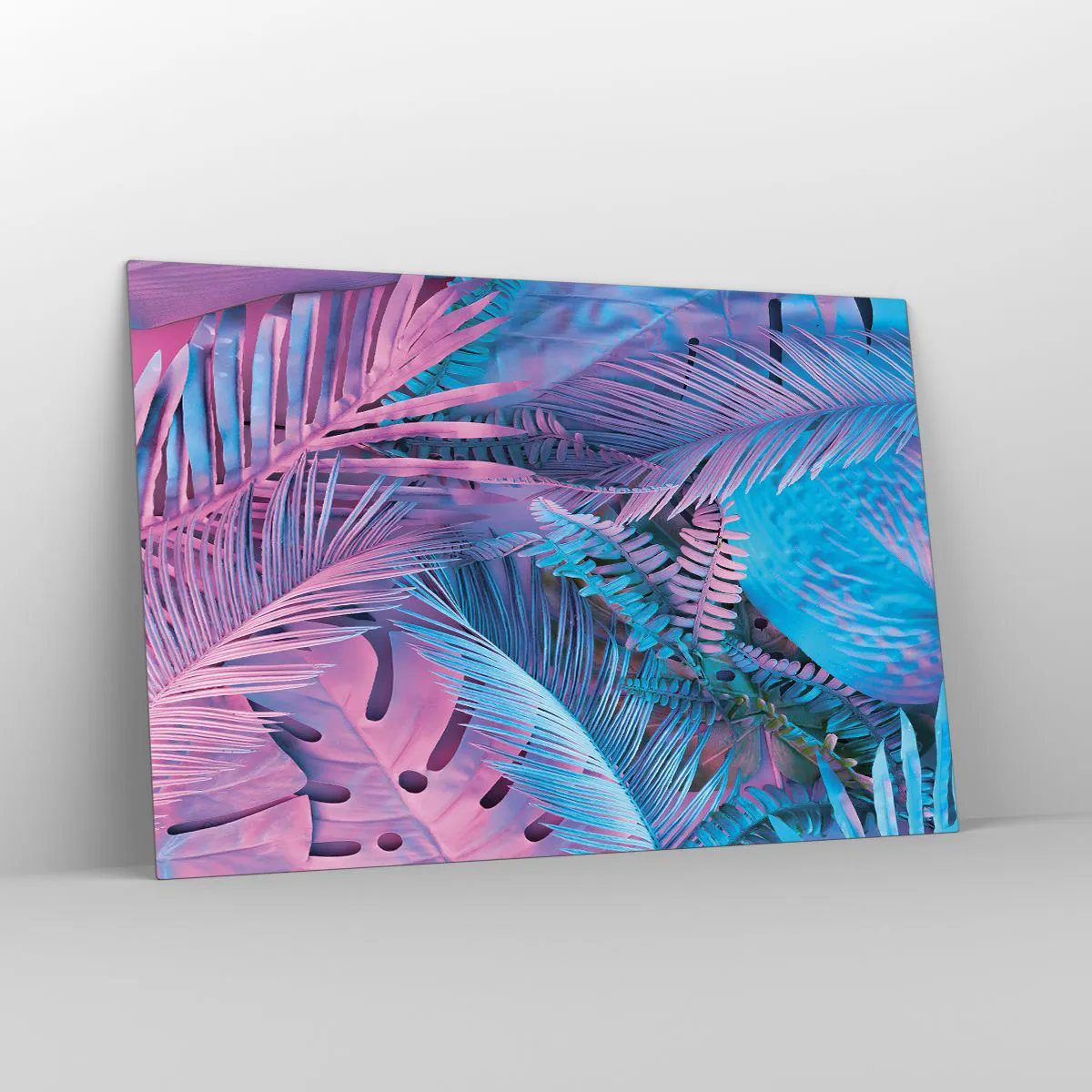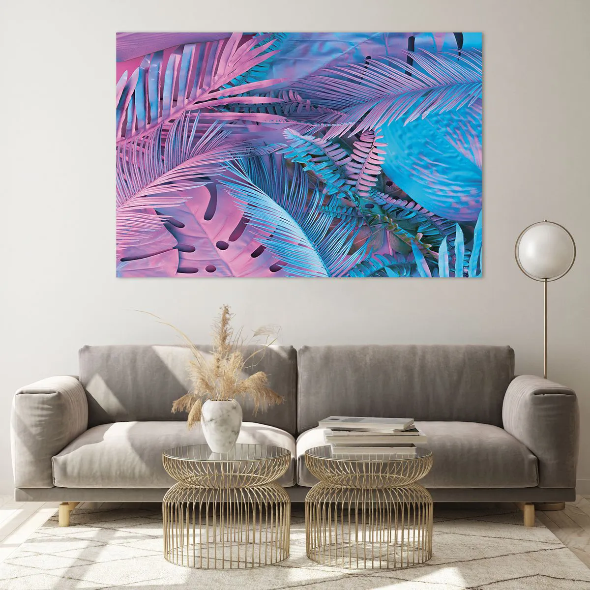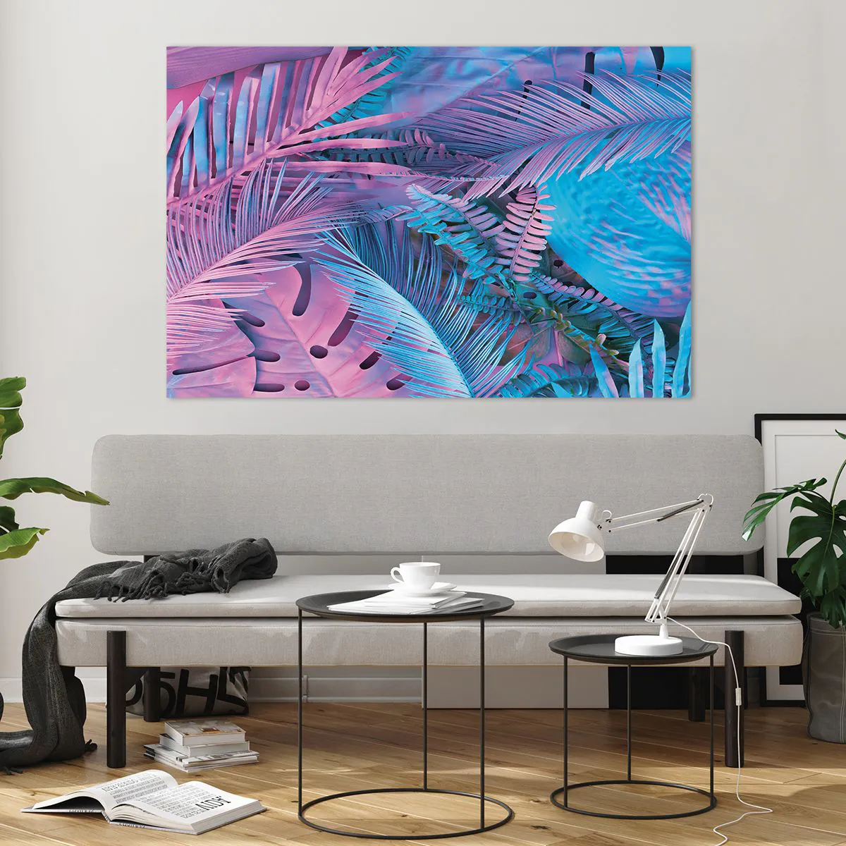 Glasbild - Bild auf glas - Tropische Blätter in Rosa- und Blautönen auf neonfarbenem Hintergrund - 120x80cm - Tropen in Rosa und Blau - Moderne Wanddekoration für Wohnzimmer und Schlafzimmer ARTTOR