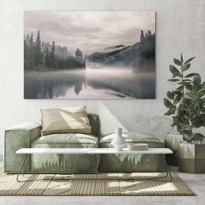 Glasbild - Bild auf glas - Morgendlicher Blick auf einen See im Wald, in Nebel gehüllt - 120x80cm - In Reflexion, im Nebel - Moderne Wanddekoration für Wohnzimmer und Schlafzimmer ARTTOR