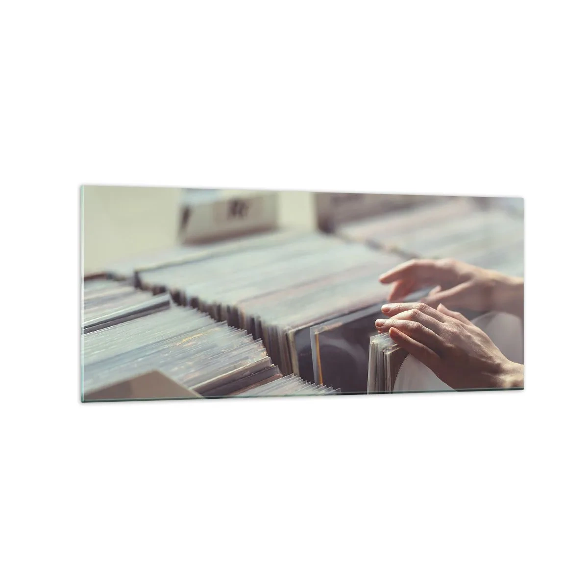 Glasbild - Bild auf glas - Hände blättern durch eine Vinylsammlung - 120x50cm - Auf der Suche nach Emotionen - Moderne Wanddekoration für Wohnzimmer und Schlafzimmer ARTTOR
