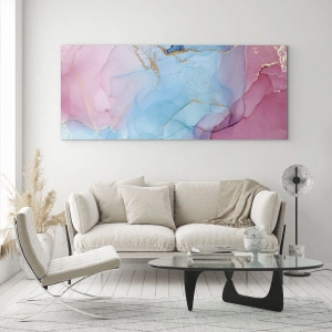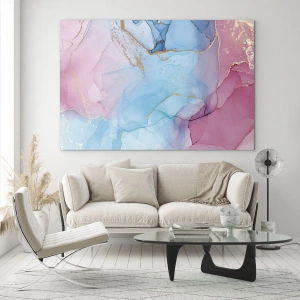 - Ein Gemälde, das eine abstrakte Kombination aus Rosa-, Blau- und Goldtönen darstellt.