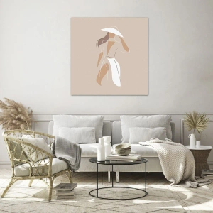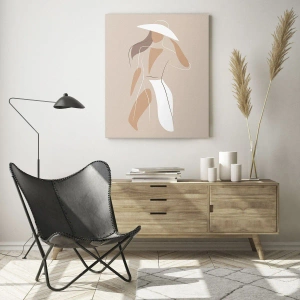 Glasbild - Bild auf glas - Eine minimalistische Zeichnung einer Frau mit Hut auf beigem Hintergrund. - 80x120cm - Mode macht Spaß - Moderne Wanddekoration für Wohnzimmer und Schlafzimmer ARTTOR