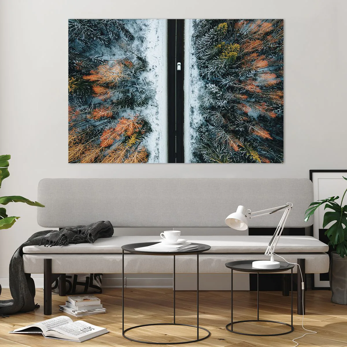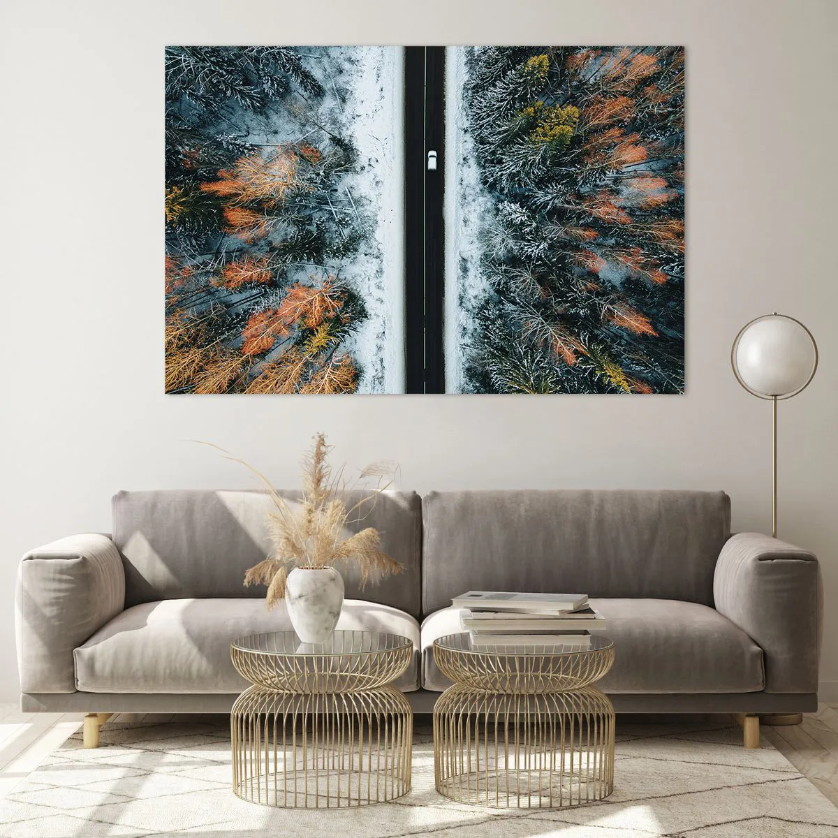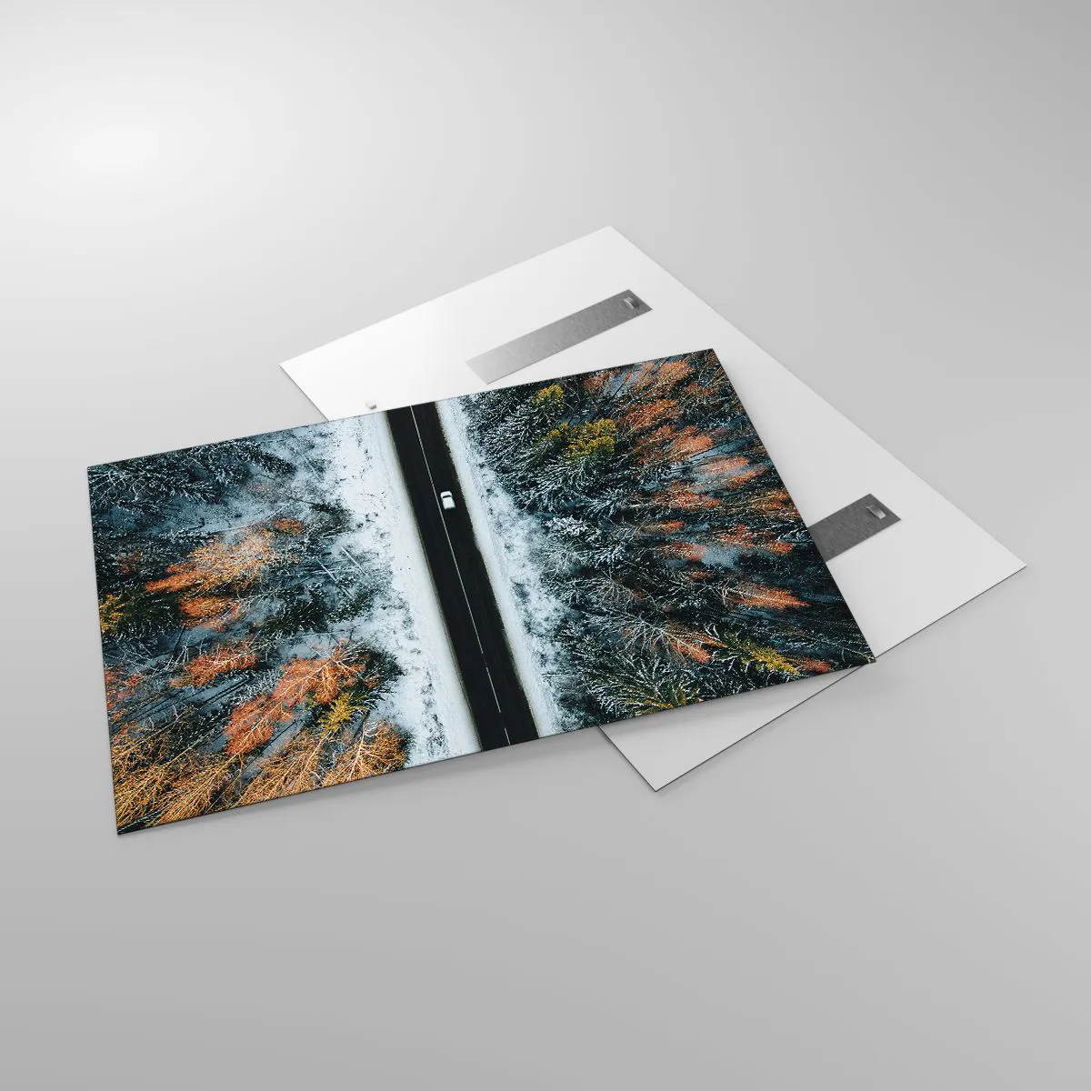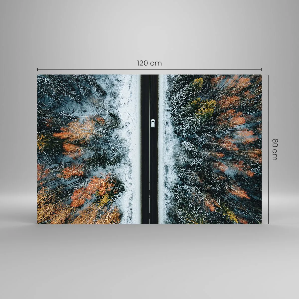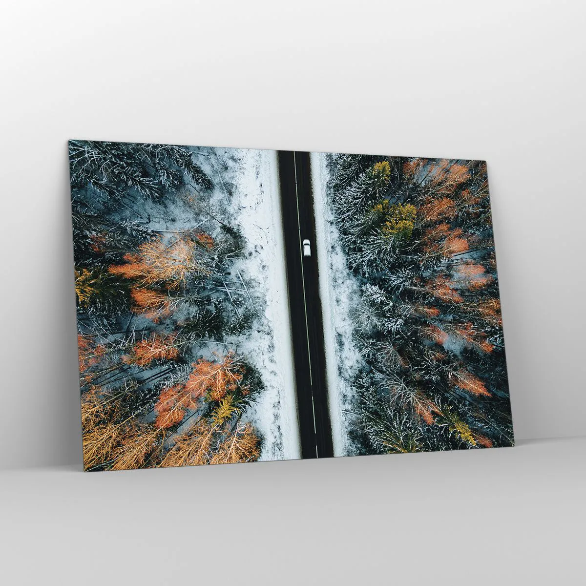 Glasbild - Bild auf glas - Eine Winterstraße durch einen schneebedeckten Wald mit bunten Bäumen - 120x80cm - Schnitt durch den Winterwald - Moderne Wanddekoration für Wohnzimmer und Schlafzimmer ARTTOR
