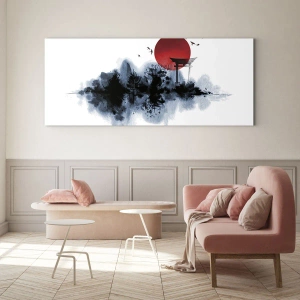 Die Komposition im Aquarellstil und eine begrenzte Farbpalette – Schwarz, Blau und Rot – schaffen ein harmonisches Ganzes und verleihen dem Raum eine Atmosphäre der Ruhe und meditativen Stimmung. Leicht verschwommene Konturen und die Präsenz fliegender Vögel verstärken das Gefühl von Weite und Freiheit. Dieses Gemälde ist die perfekte Wahl für moderne Innenräume mit asiatischen Akzenten.