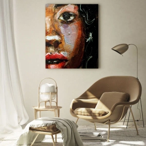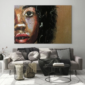 Glasbild - Bild auf glas - Ein ausdrucksstarkes Frauenporträt in intensiven Farben. - 80x120cm - Schwarz und Glanz - Moderne Wanddekoration für Wohnzimmer und Schlafzimmer ARTTOR