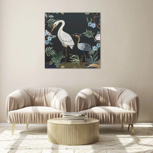 Glasbild - Bild auf glas - Gemalte Vögel und Pflanzen auf dunklem Hintergrund mit elegantem Muster - 80x120cm - Vogelparade - Moderne Wanddekoration für Wohnzimmer und Schlafzimmer ARTTOR