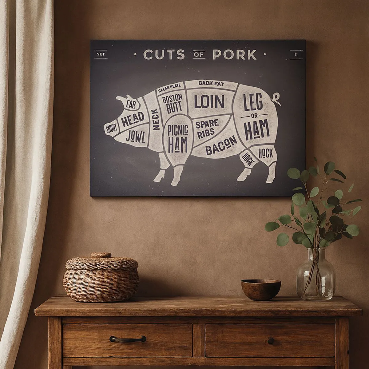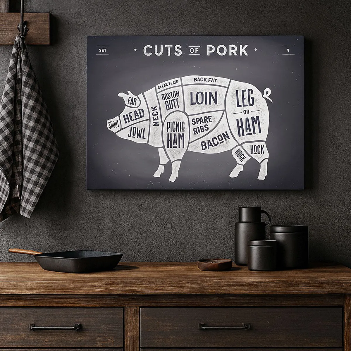 - Dieser stilvolle Druck zeigt ein Diagramm von Schweinefleischstücken im klassischen Stil vor schwarzem Hintergrund. Perfekt für Küchen, Esszimmer oder kulinarisch inspirierte Innenräume.