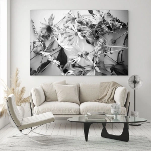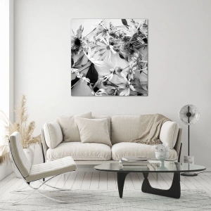 Glasbild - Bild auf glas - Verstreute schwarz-weiße Blumen in einem kunstvollen Arrangement - 100x70cm - Kein Blumenstrauß - Moderne Wanddekoration für Wohnzimmer und Schlafzimmer ARTTOR
