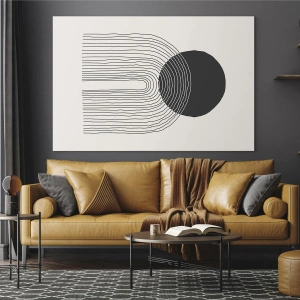 - Ein abstraktes, minimalistisches Kunstwerk mit einem schwarzen Kreis und dünnen Linien auf hellem Hintergrund. Diese moderne Kunstform passt perfekt in skandinavische oder moderne Innenräume. Der 70x50 cm große Druck ist auf Glas gedruckt.