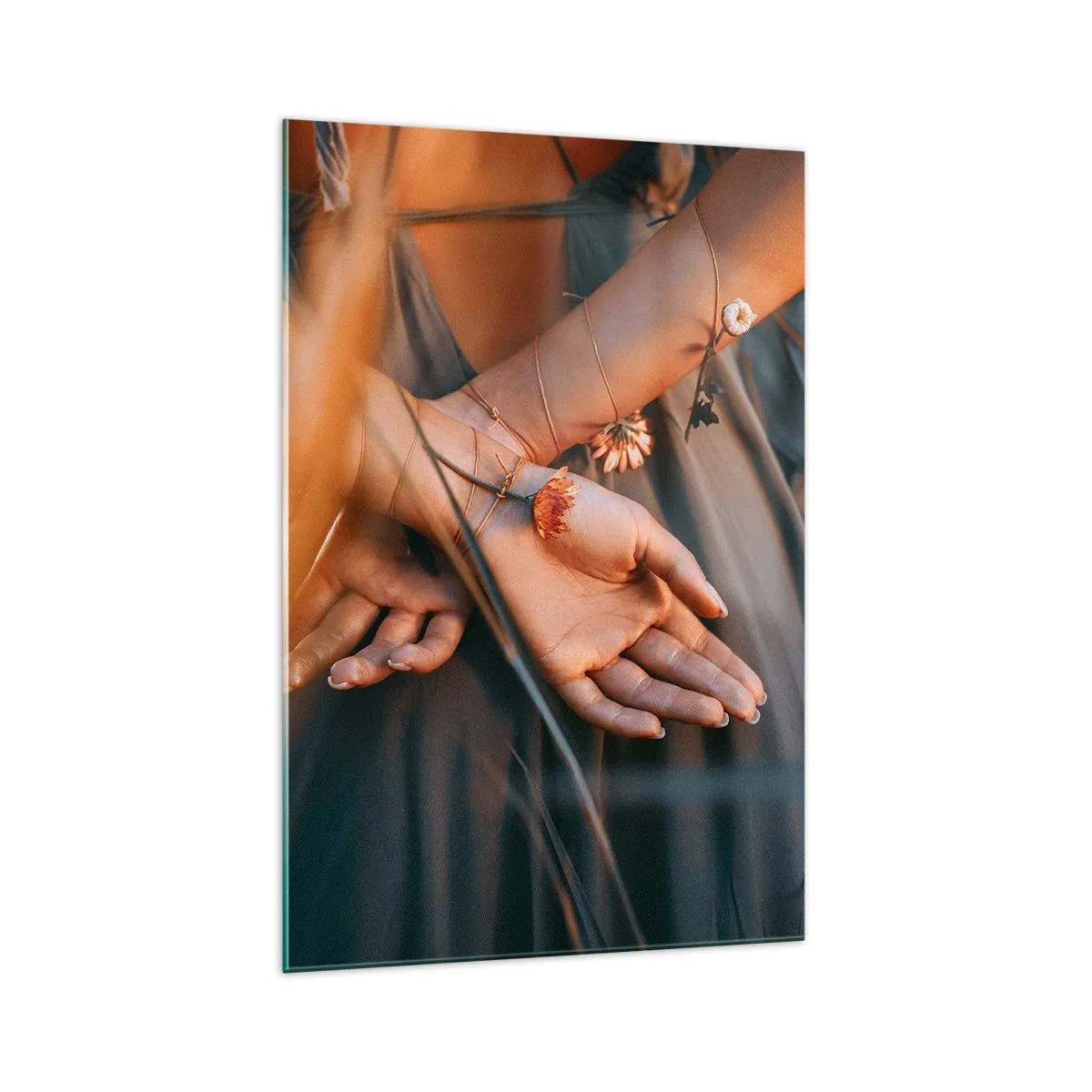 Glasbild - Bild auf glas - Sinnliche Hände mit Blumen in einer natürlichen Umgebung - 70x100cm - Verbunden mit der Natur - Moderne Wanddekoration für Wohnzimmer und Schlafzimmer ARTTOR