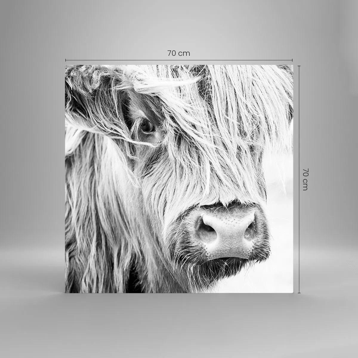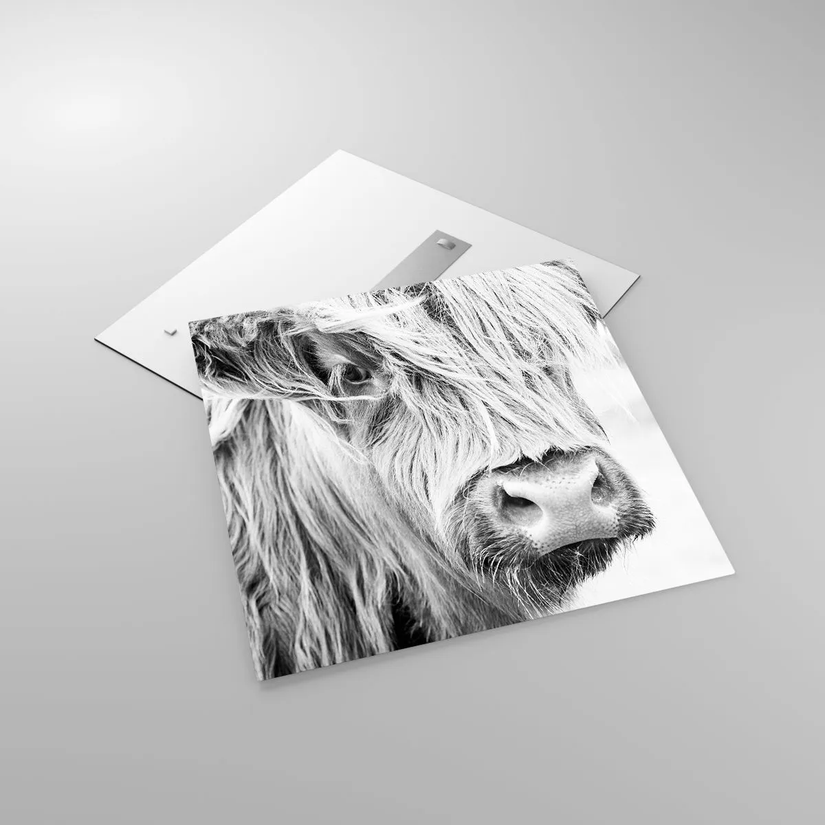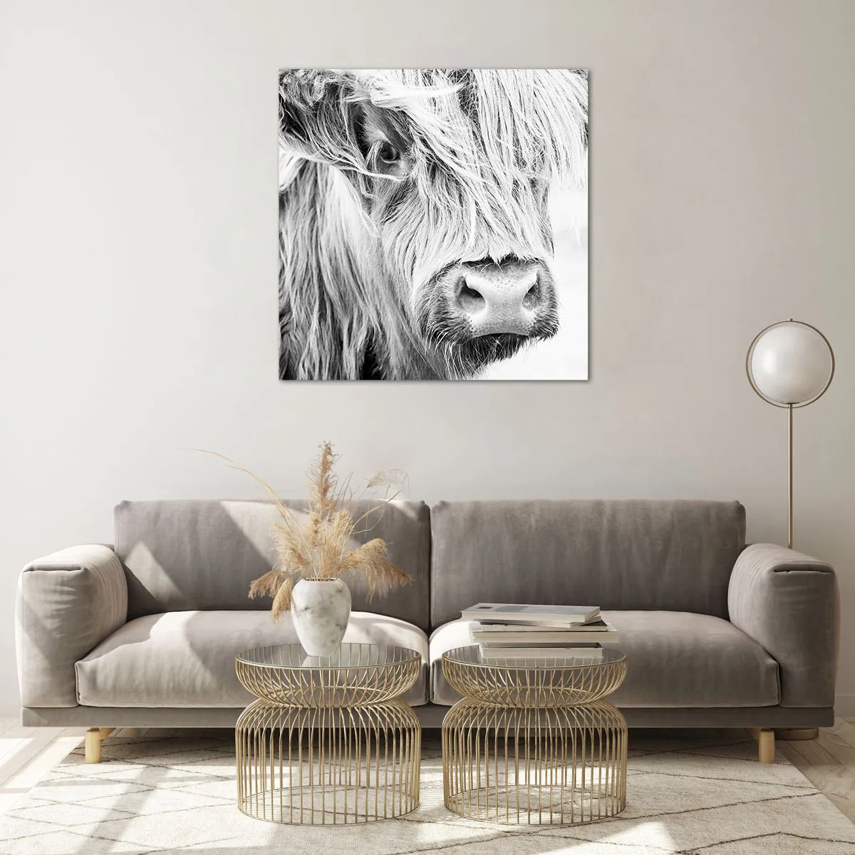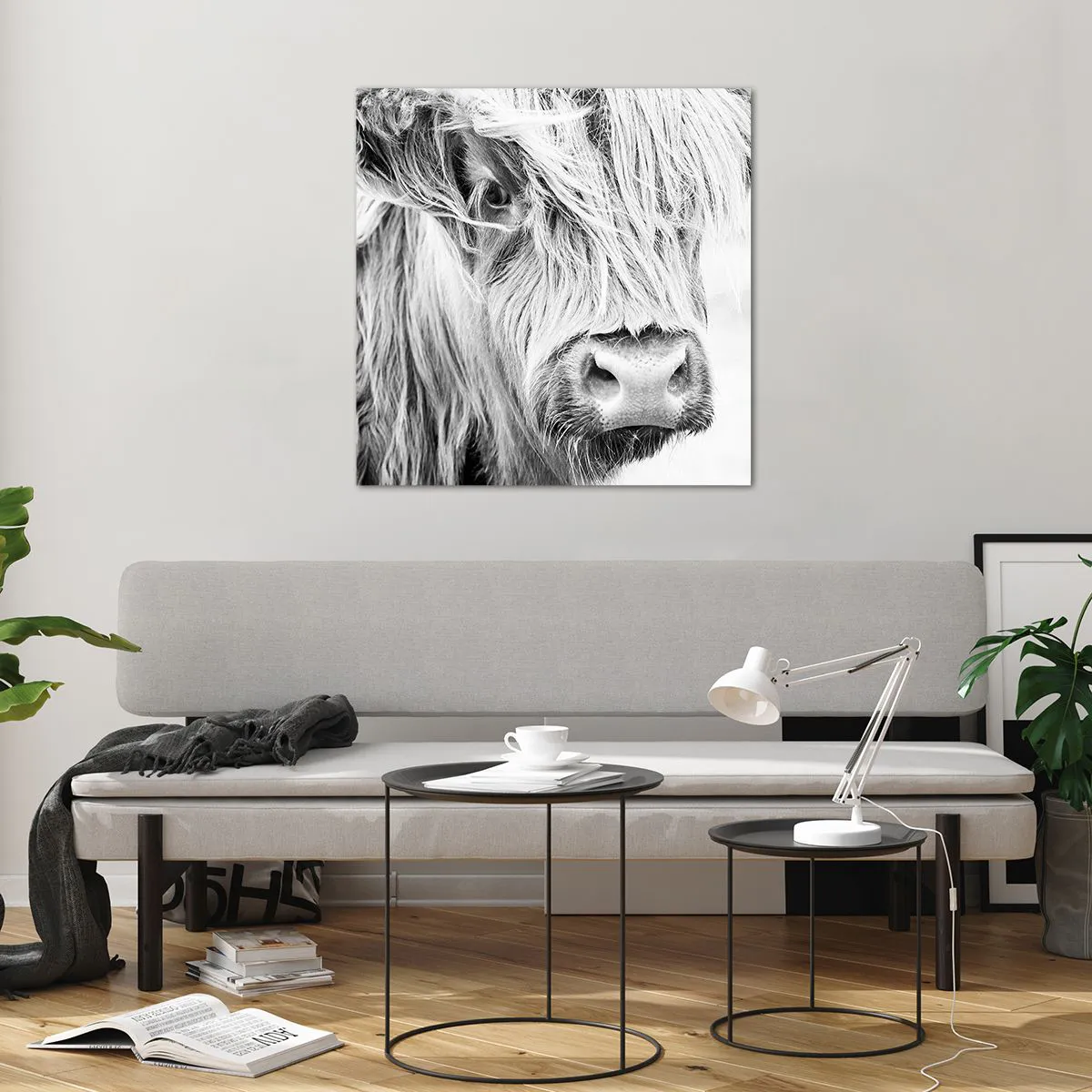 • Schottische Bergkuh, Tiere, Schwarz und Weiß, Schwarzweiß, Natur, Tiere, Für das Büro, für das Arbeitszimmer, für das Esszimmer, für den Flur, für das Wohnzimmer, für das Schlafzimmer, Weiß, Grau, Schwarz und Weiß, Quadrat