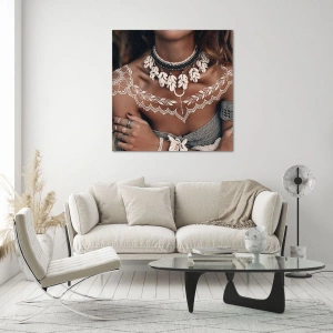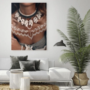 Glasbild - Bild auf glas - Nahaufnahme einer Frau mit einer Muschelkette und einem weißen Tattoo - 100x70cm - Talismane, Rituale der Weiblichkeit - Moderne Wanddekoration für Wohnzimmer und Schlafzimmer ARTTOR
