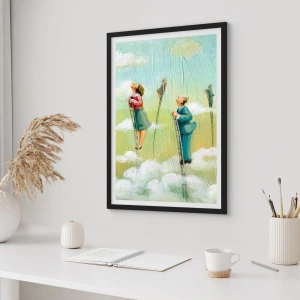 - Dieses Poster zeigt Figuren, die in einer surrealen Wolkenlandschaft Leitern erklimmen. Der künstlerische Malstil unterstreicht den einzigartigen Charakter des Bildes. Perfekt für moderne und inspirierende Interieurs.