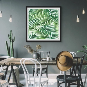 Die Palmblätter sind in leuchtenden Grüntönen dargestellt, die den Raum beleben und eine entspannte Atmosphäre schaffen. Subtile Details betonen die Schönheit der Natur, und durch die minimalistische Anordnung der Blätter passt das Poster perfekt zu einem modernen Dekorationsstil.