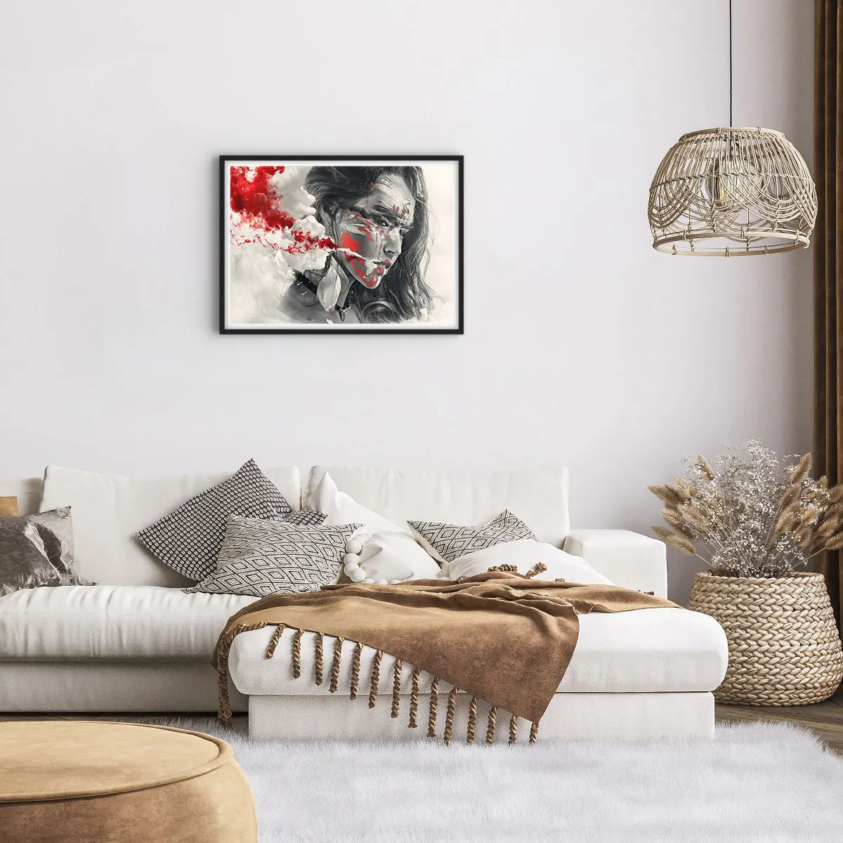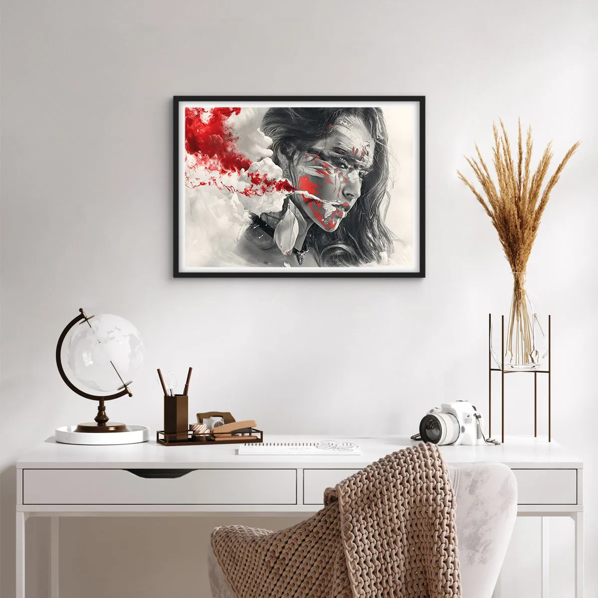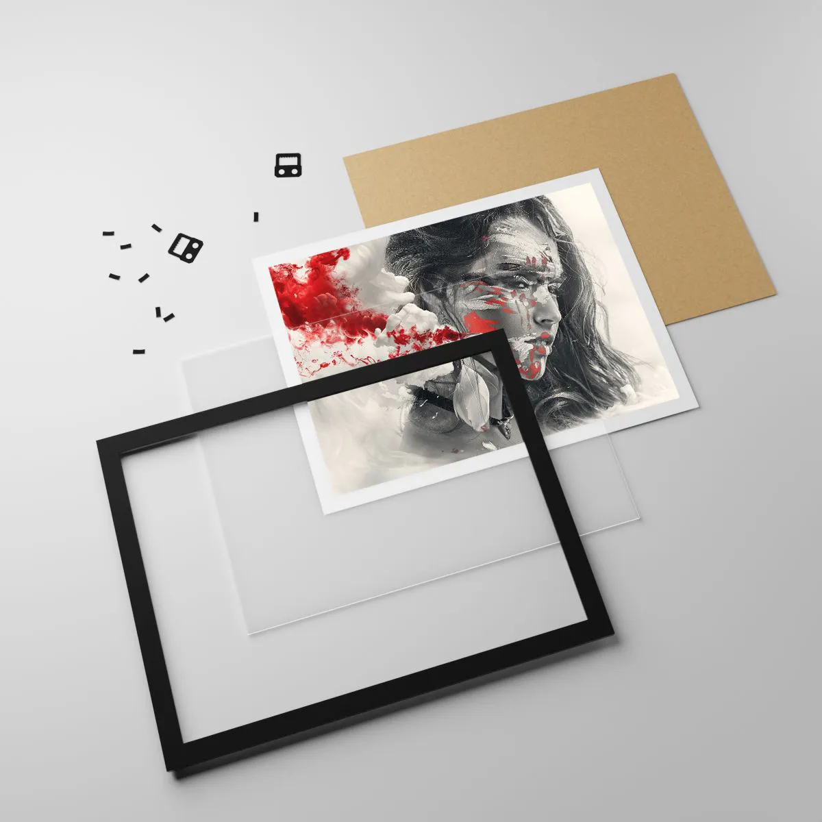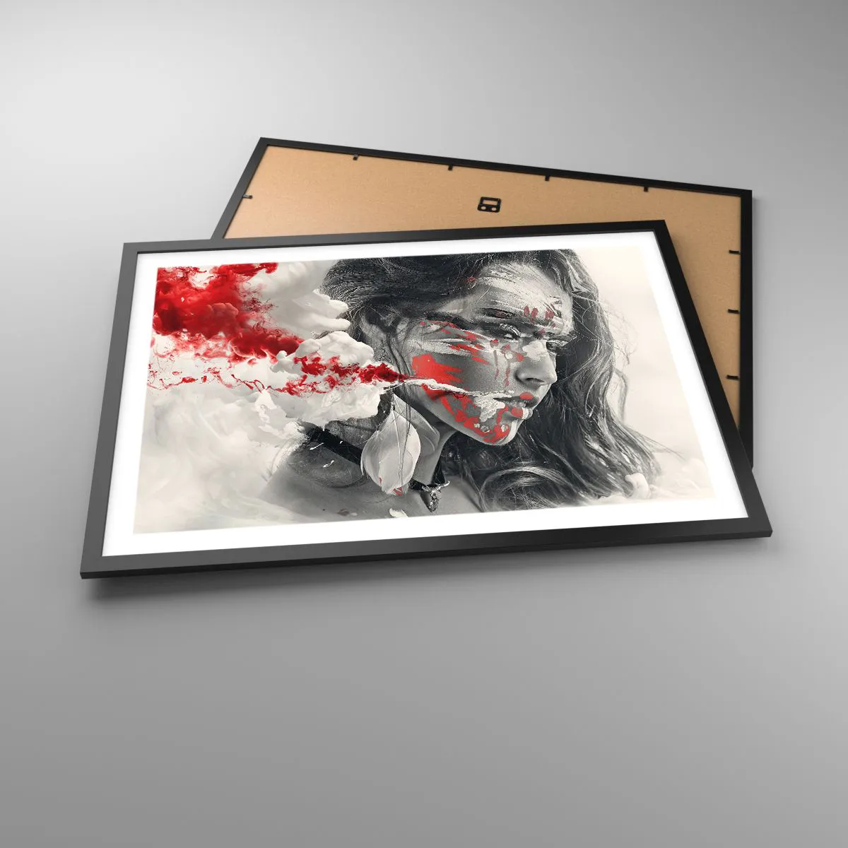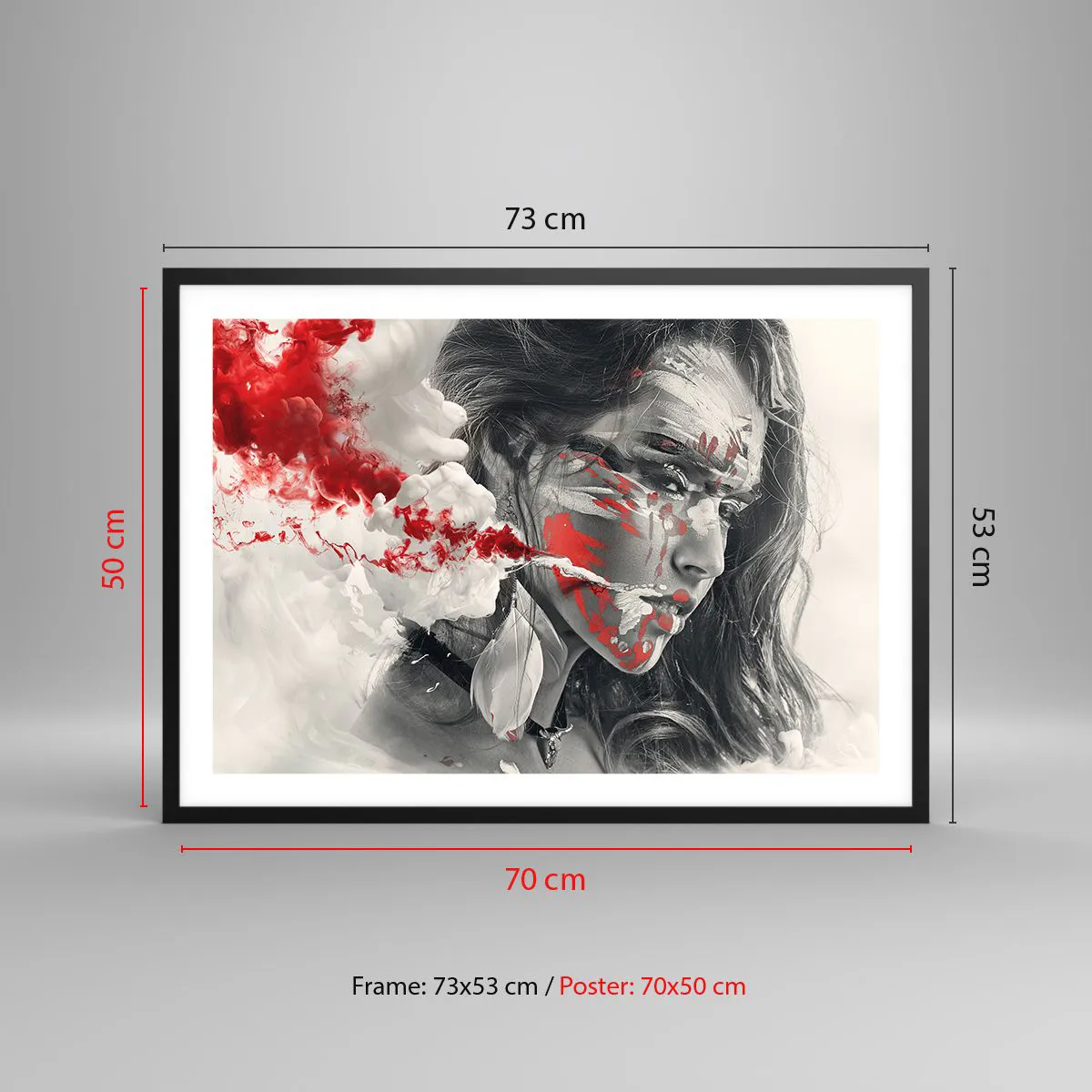 Poster in einem schwarzem Rahmen - Künstlerisches Frauenportrait mit abstrakten roten Akzenten - 70x50cm - Im Dunst der Absurdität - Moderne Wanddekoration für Wohnzimmer und Schlafzimmer ARTTOR