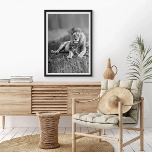 Poster in einem schwarzem Rahmen - Löwe ruht auf einem Felsen im monochromen Stil - 70x50cm - Königliche Siesta - Moderne Wanddekoration für Wohnzimmer und Schlafzimmer ARTTOR