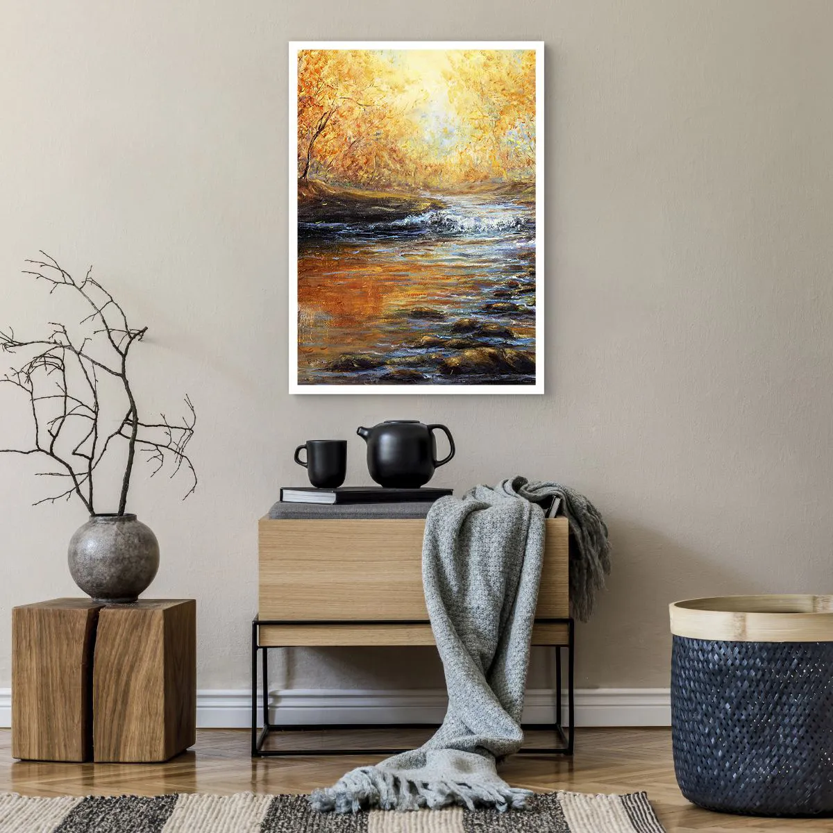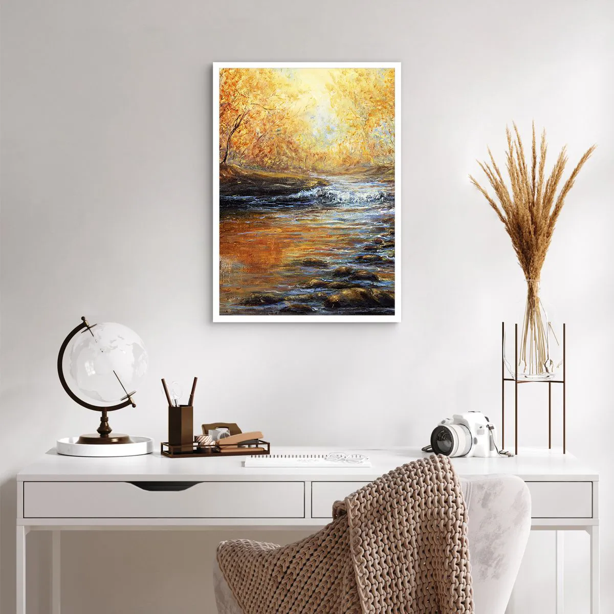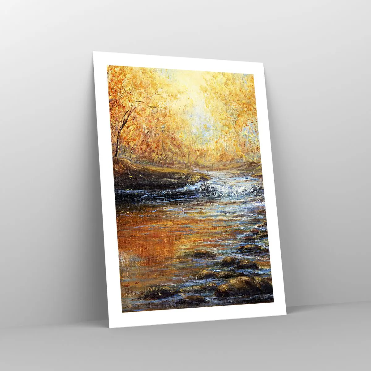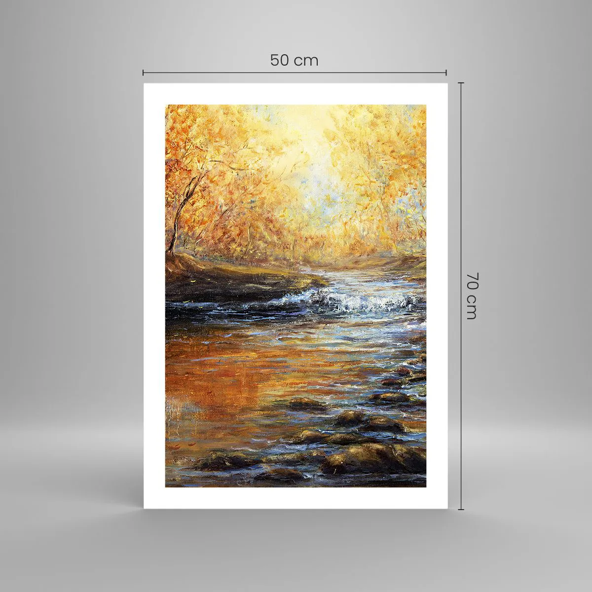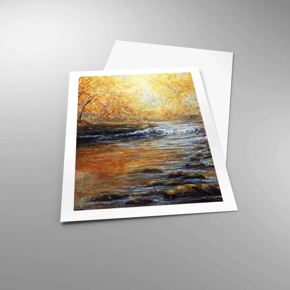 Poster - Ein herbstlicher Bach, umgeben von goldenen Bäumen - 50x70cm - Der goldene Strom - Moderne Wanddekoration für Wohnzimmer und Schlafzimmer ARTTOR