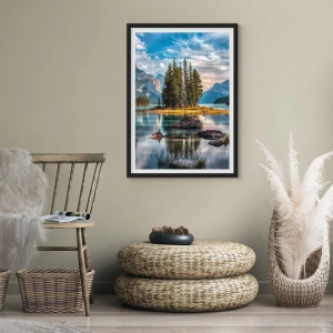 Poster in einem schwarzem Rahmen - Eine Berglandschaft mit einer Insel, umgeben von einem ruhigen See - 70x50cm - An dem tollen und sauberen Wasser ... - Moderne Wanddekoration für Wohnzimmer und Schlafzimmer ARTTOR