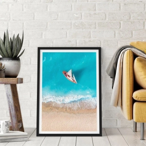 Poster in einem schwarzem Rahmen - Eine Vogelperspektive auf ein Boot am Strand - 70x50cm - An der Grenze von Blau und Gold - Moderne Wanddekoration für Wohnzimmer und Schlafzimmer ARTTOR