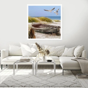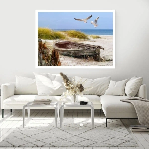 Poster - Verlassenes Boot an einem Strand mit Möwen - 100x70cm - In Wind gebadet - Moderne Wanddekoration für Wohnzimmer und Schlafzimmer ARTTOR