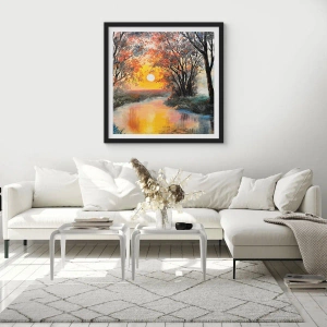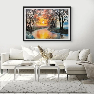 Poster in einem schwarzem Rahmen - Sonnenuntergang über dem Fluss in einer Herbstlandschaft - 70x50cm - Herbststimmung - Moderne Wanddekoration für Wohnzimmer und Schlafzimmer ARTTOR