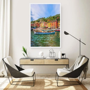 Poster - Hafenszene mit bunten Gebäuden und Booten - 50x70cm - Italienischer Morgen - Moderne Wanddekoration für Wohnzimmer und Schlafzimmer ARTTOR