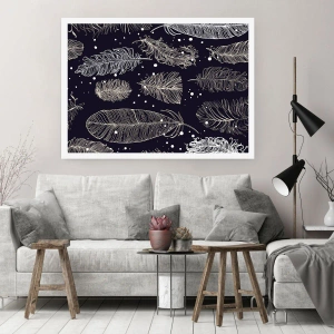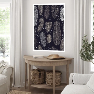 Poster - Weiße Federn auf schwarzem Hintergrund in elegantem Arrangement - 50x70cm - Gefiederte Spitze - Moderne Wanddekoration für Wohnzimmer und Schlafzimmer ARTTOR