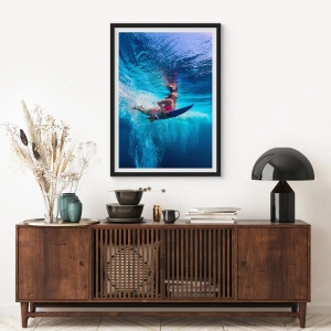 Poster in einem schwarzem Rahmen - Ein Surfer unter Wasser in einer dynamischen Komposition in Blautönen. - 70x50cm - Tiefe der Freude - Moderne Wanddekoration für Wohnzimmer und Schlafzimmer ARTTOR