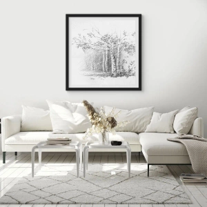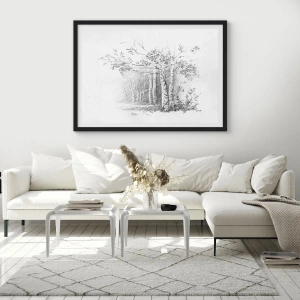 Poster in einem schwarzem Rahmen - Eine Zeichnung eines Birkenwaldes in einer subtilen Bleistiftskizze - 70x50cm - Das Licht des Birkenwaldes - Moderne Wanddekoration für Wohnzimmer und Schlafzimmer ARTTOR