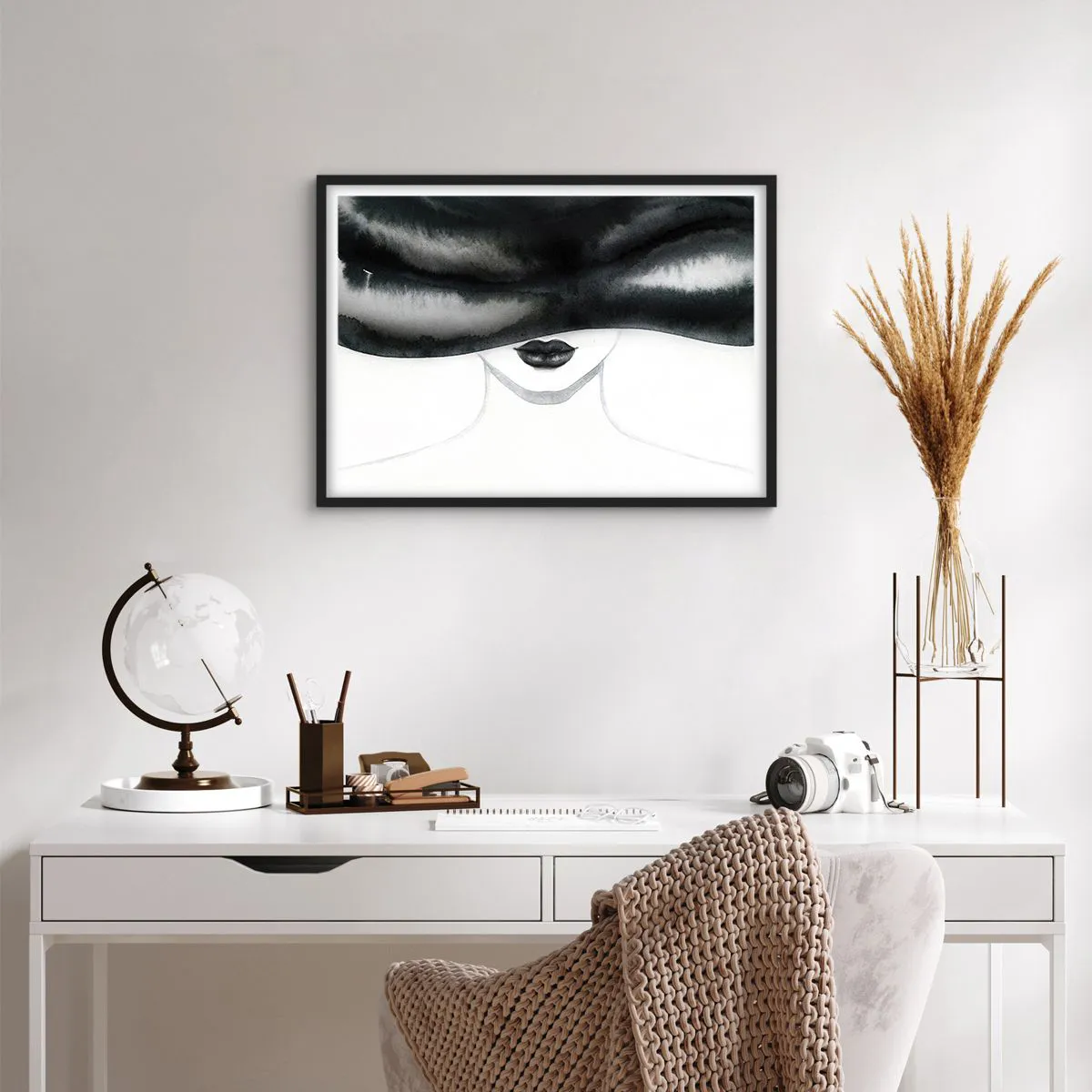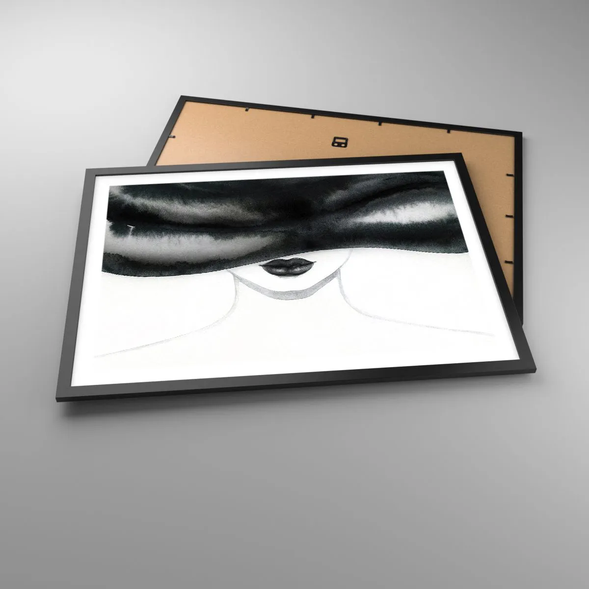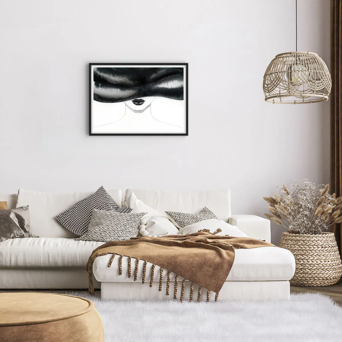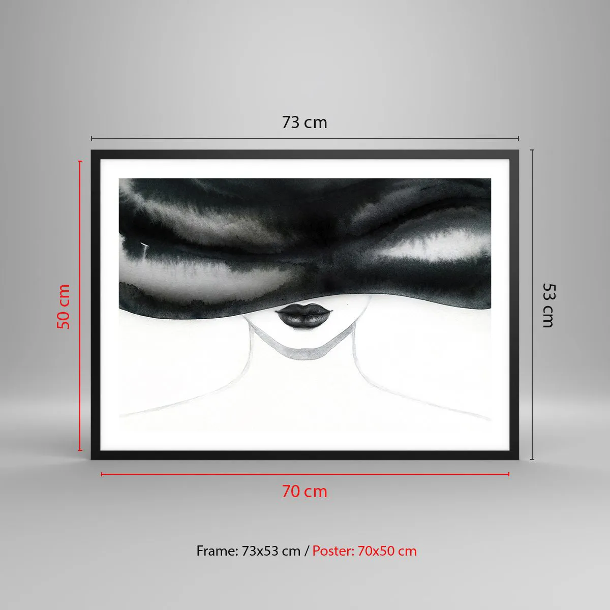 Poster in einem schwarzem Rahmen - Ein subtiles Porträt einer Frau, deren Gesicht in einem monochromen Stil bedeckt ist. - 70x50cm - Ein sinnliches Geheimnis - Moderne Wanddekoration für Wohnzimmer und Schlafzimmer ARTTOR