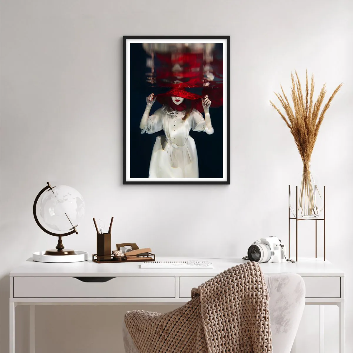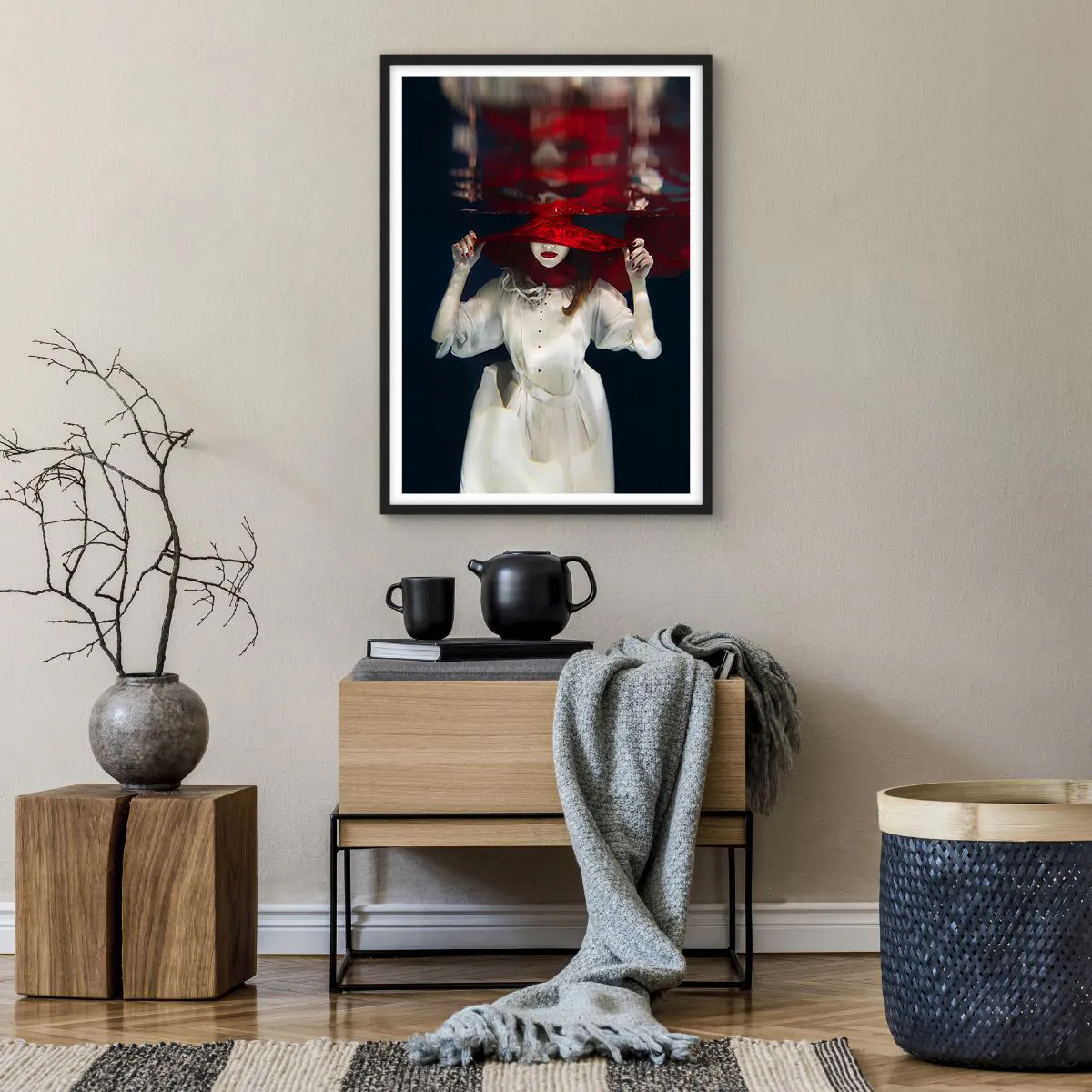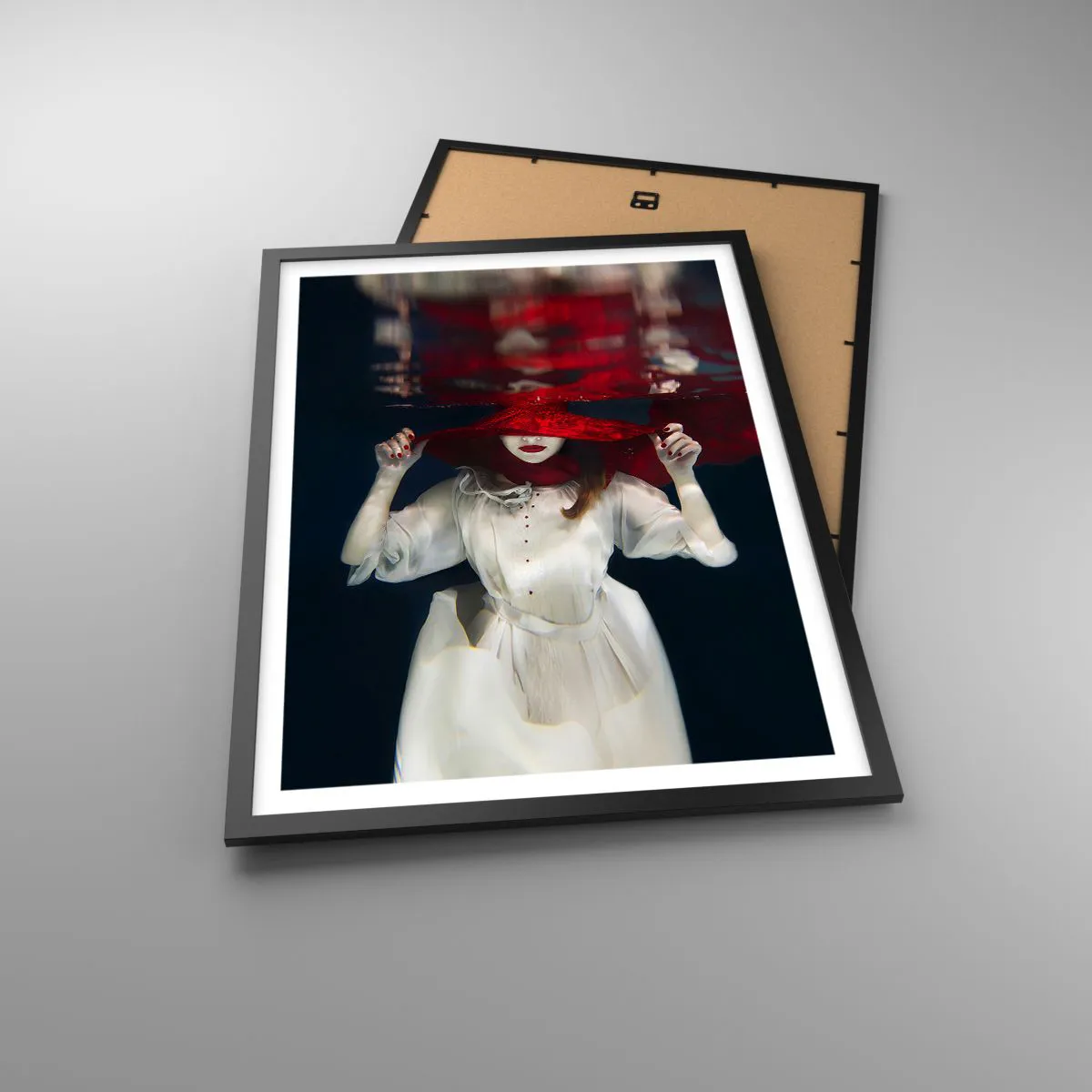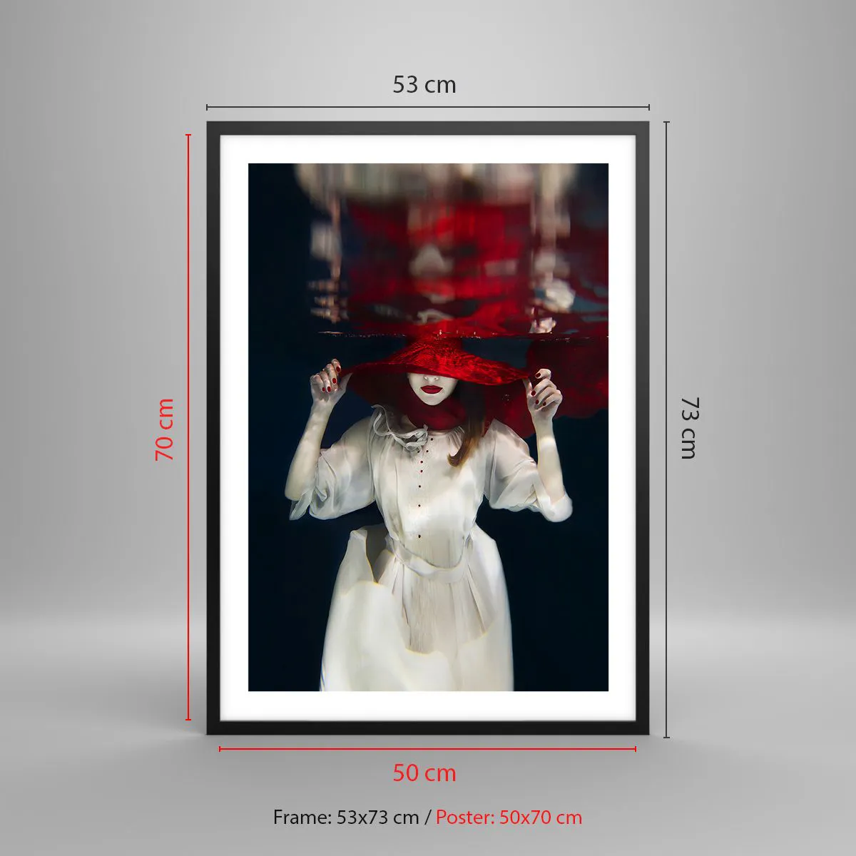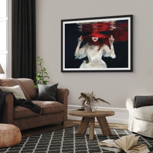 Poster in einem schwarzem Rahmen - Eine Frau mit einem roten Hut ist unter Wasser getaucht. - 50x70cm - Boshafte Göttin in der slawischen Mythologie - Moderne Wanddekoration für Wohnzimmer und Schlafzimmer ARTTOR