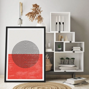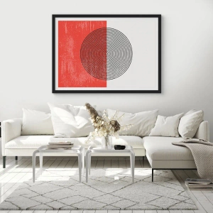 Poster in einem schwarzem Rahmen - Geometrische Komposition mit Kreisen auf rot-weißem Hintergrund - 50x70cm - Auf den Punkt gebracht - Moderne Wanddekoration für Wohnzimmer und Schlafzimmer ARTTOR