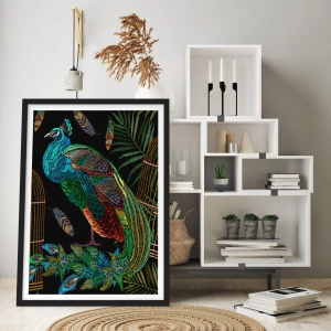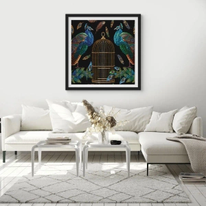 Poster in einem schwarzem Rahmen - Pfauen neben einem goldenen Käfig auf schwarzem Hintergrund - 70x50cm - In königlichen Gewändern - Moderne Wanddekoration für Wohnzimmer und Schlafzimmer ARTTOR