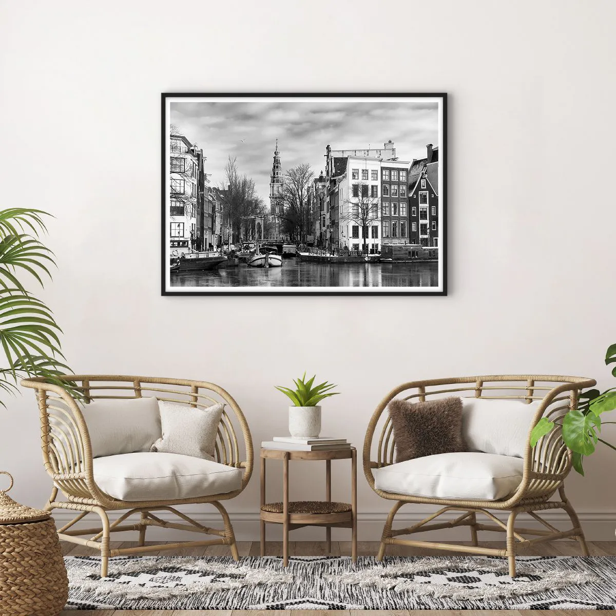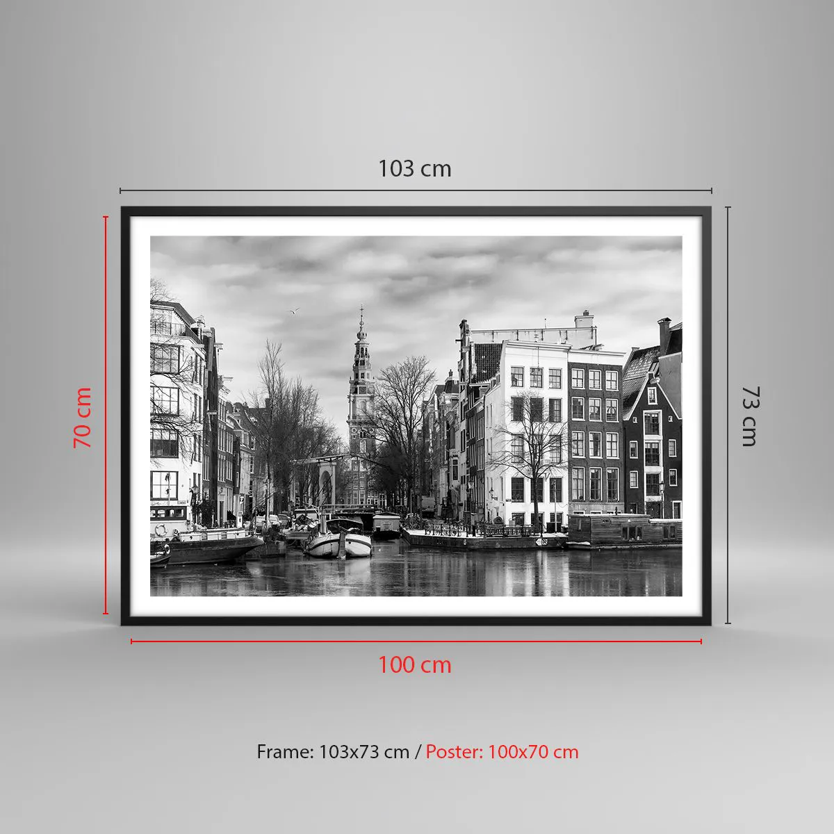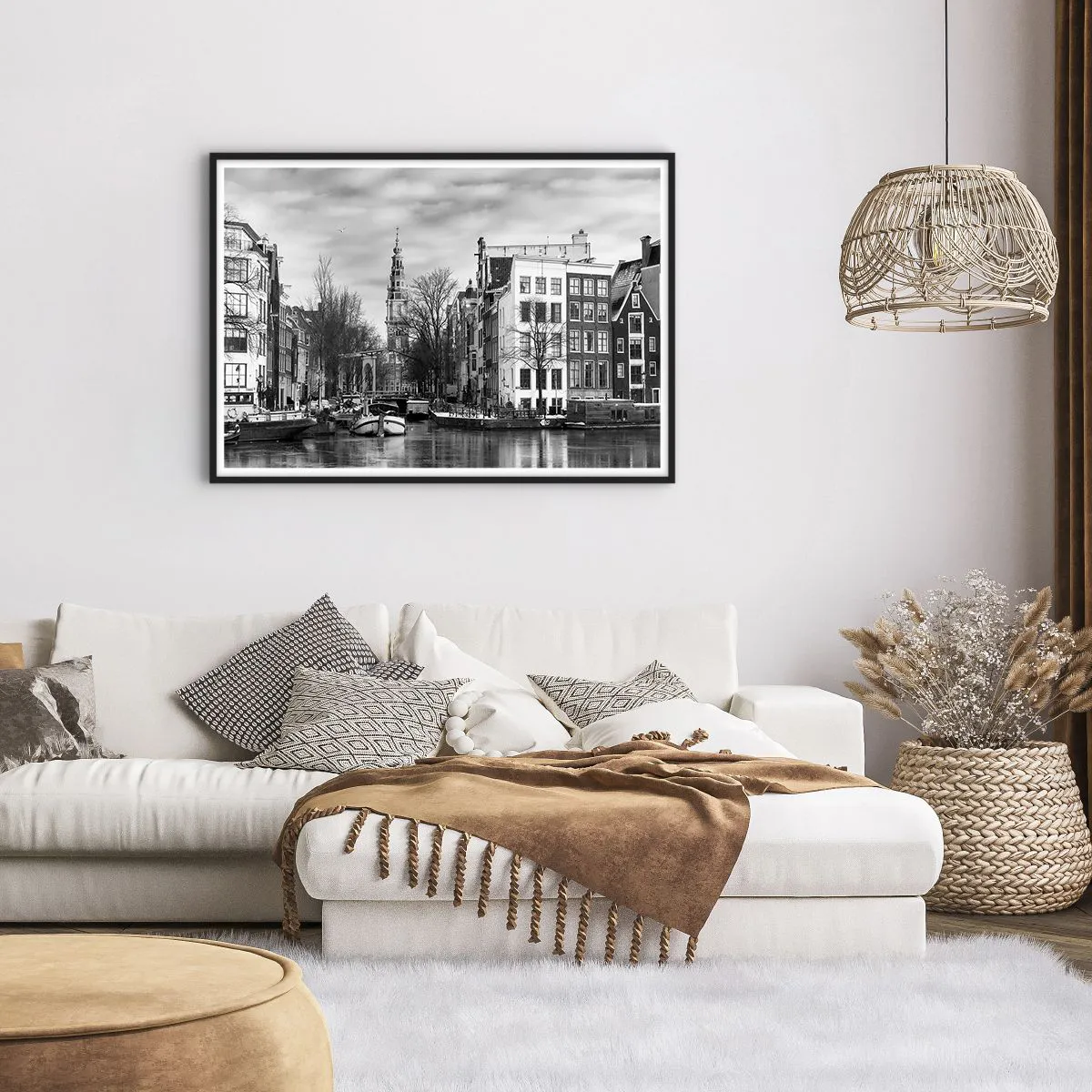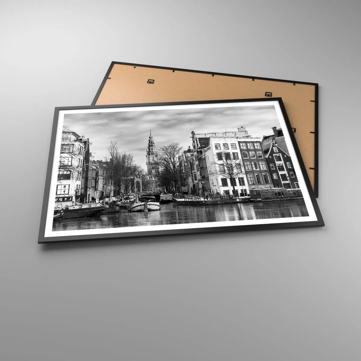 Poster in einem schwarzem Rahmen - Schwarz-Weiß-Panorama von Amsterdam mit Kanal und historischen Gebäuden - 100x70cm - Amsterdamer Atmosphäre - Moderne Wanddekoration für Wohnzimmer und Schlafzimmer ARTTOR