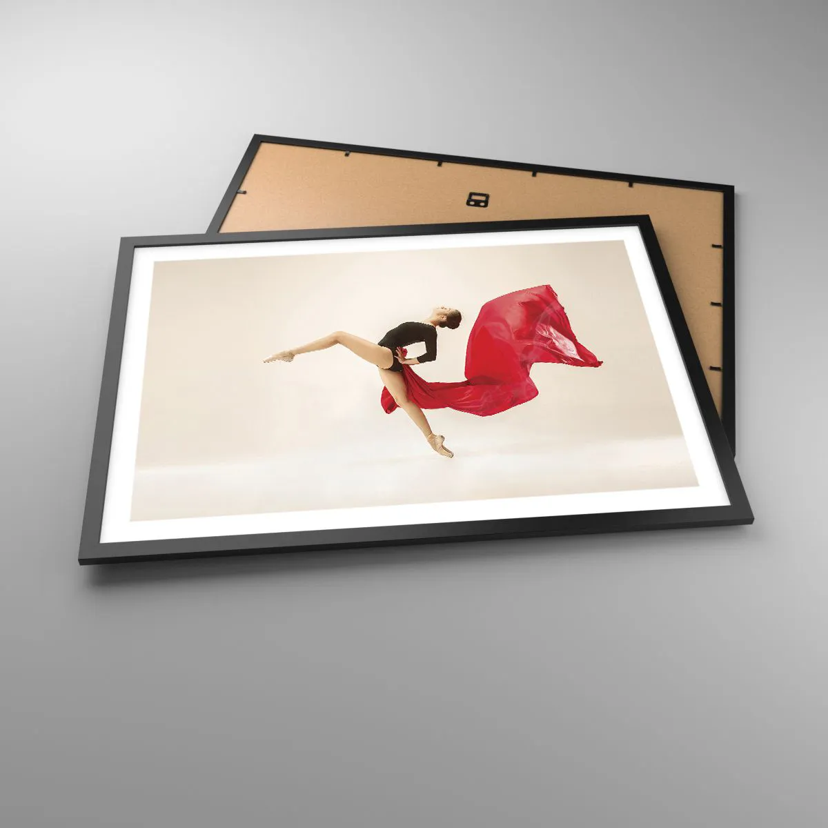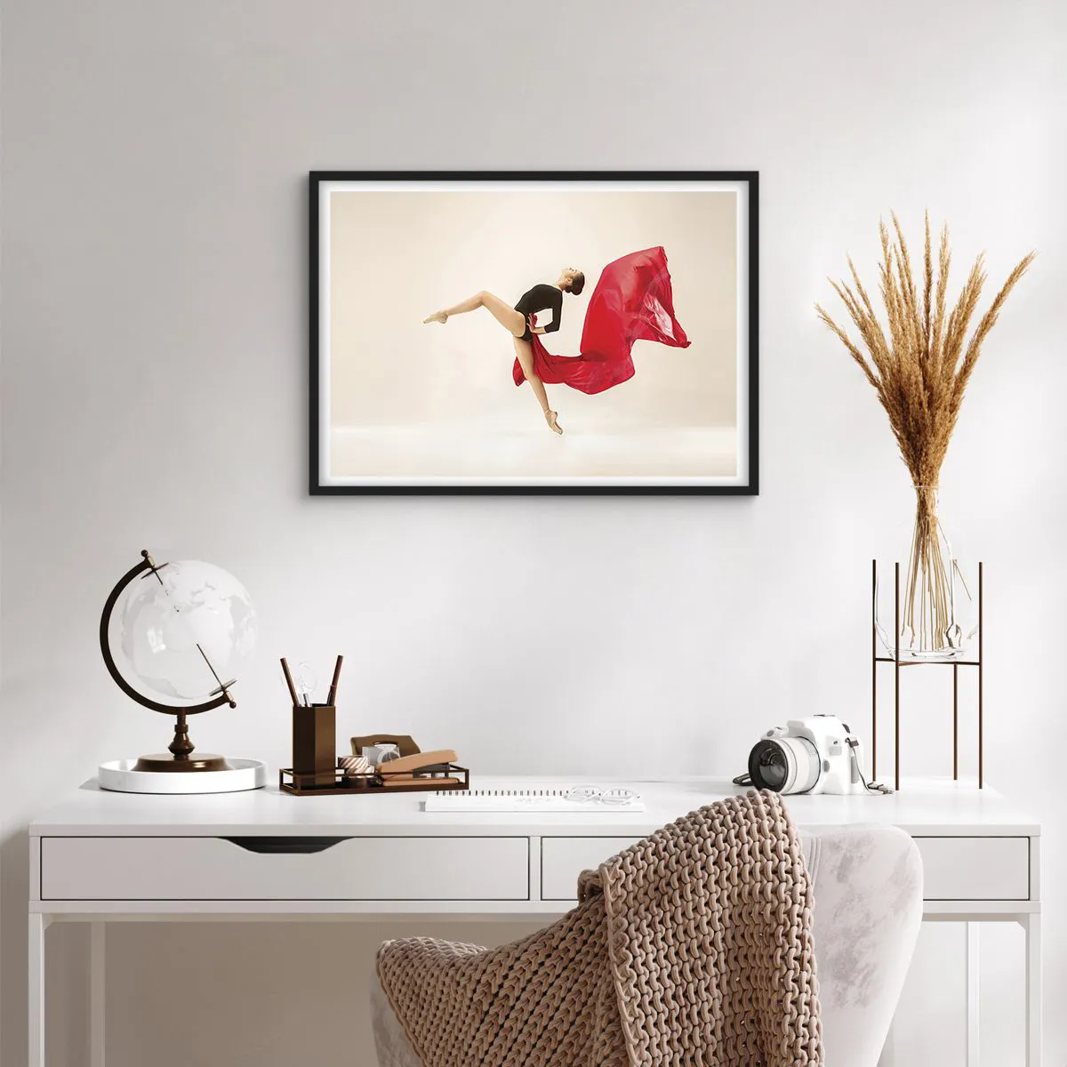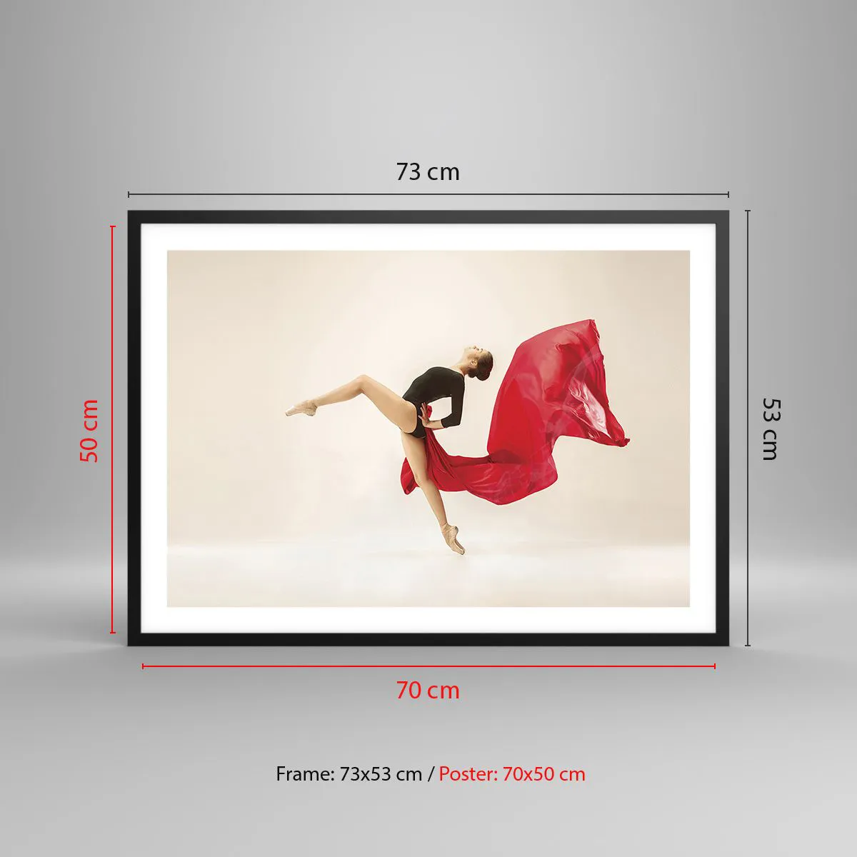 Poster in einem schwarzem Rahmen - Eine dynamische Tänzerin in schwarzem Outfit und rotem Stoff in Bewegung. - 70x50cm - Rot und Schwarz - Moderne Wanddekoration für Wohnzimmer und Schlafzimmer ARTTOR