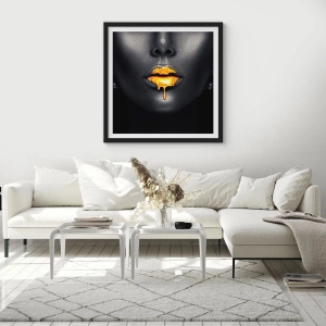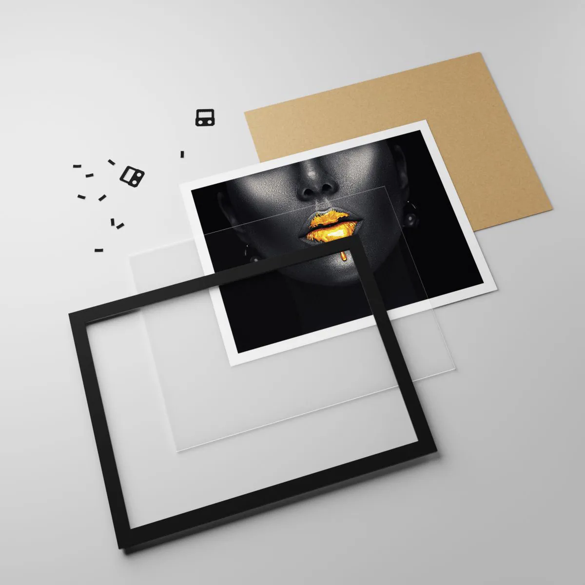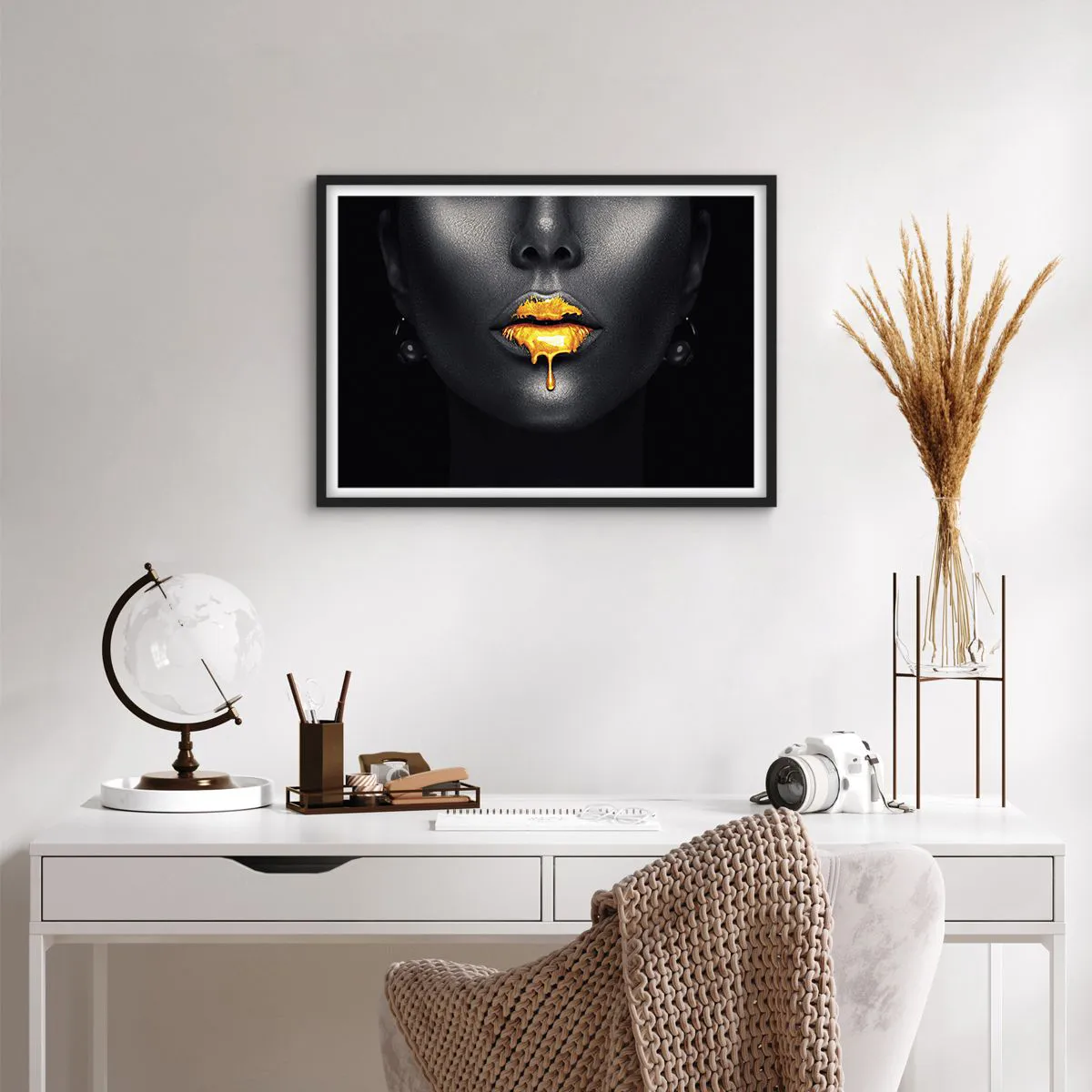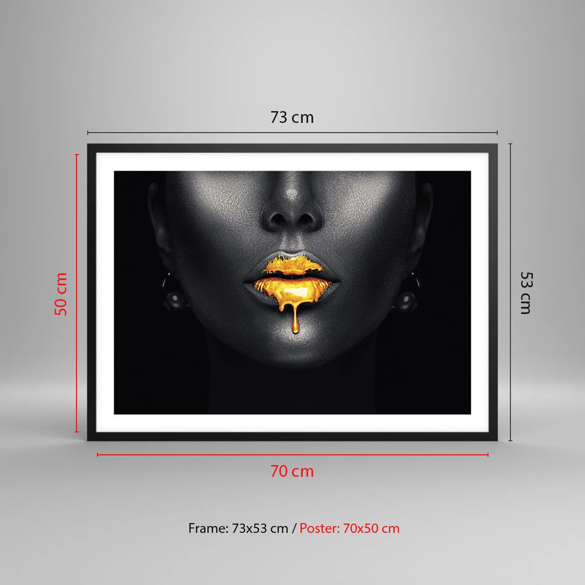Poster in einem schwarzem Rahmen - Schwarz-goldenes Porträt einer Frau mit einem Tropfen Gold auf den Lippen - 70x50cm - Goldmaul - Moderne Wanddekoration für Wohnzimmer und Schlafzimmer ARTTOR
