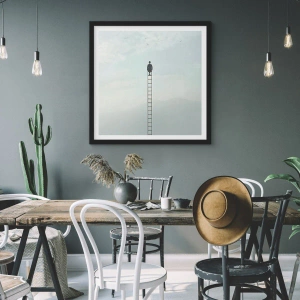 Poster in einem schwarzem Rahmen - Ein Mann auf einer Leiter, die in den Himmel ragt - 100x70cm - Erhebe dich darüber! - Moderne Wanddekoration für Wohnzimmer und Schlafzimmer ARTTOR