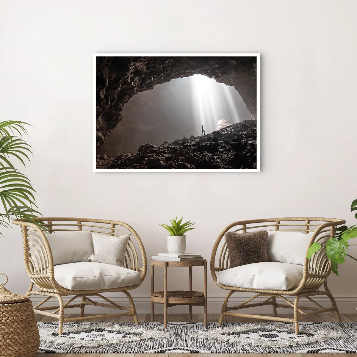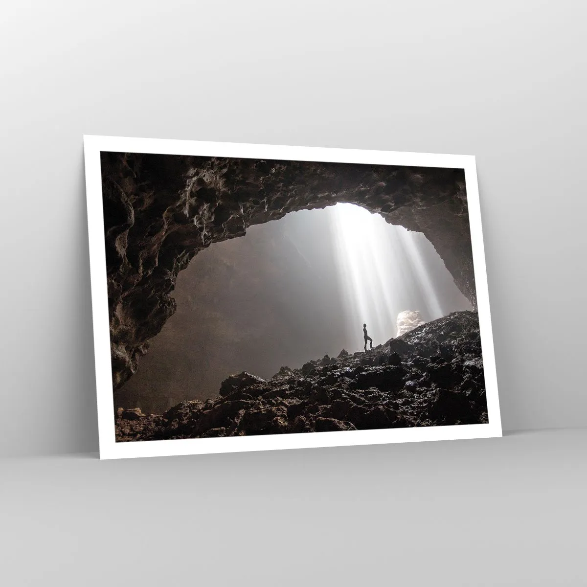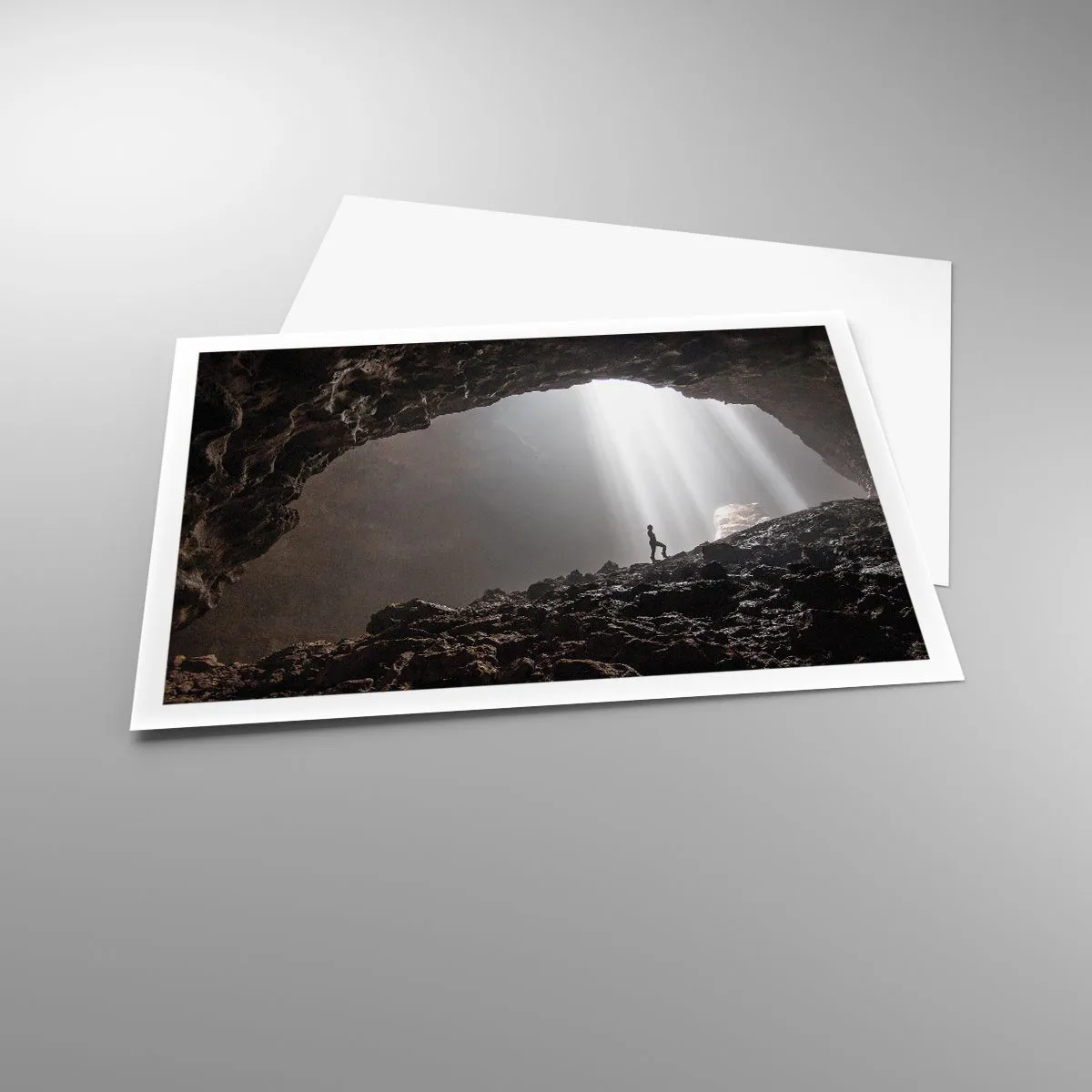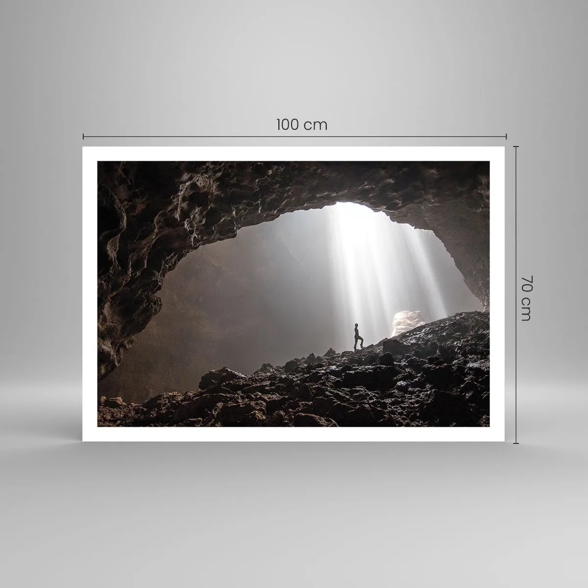Poster - Eine Figur in einer Höhle, beleuchtet von Lichtstrahlen - 100x70cm - Die leuchtende Grotte - Moderne Wanddekoration für Wohnzimmer und Schlafzimmer ARTTOR