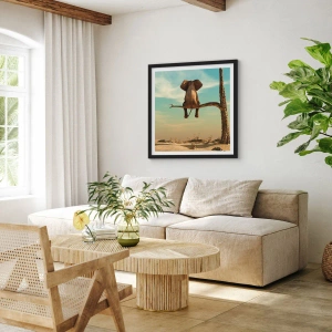 Poster in einem schwarzem Rahmen - Ein Elefant sitzt auf einem Ast und blickt auf eine Wüstenlandschaft - 100x70cm - Neuer Blickwinkel - Moderne Wanddekoration für Wohnzimmer und Schlafzimmer ARTTOR