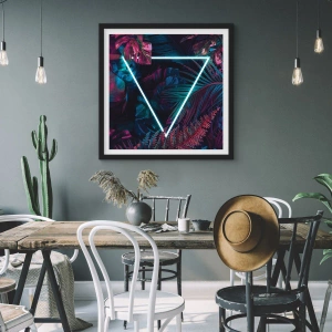 Poster in einem schwarzem Rahmen - Ein Neondreieck, umgeben von tropischen Blättern in dunklen Farben. - 100x70cm - Garten im Disco-Stil - Moderne Wanddekoration für Wohnzimmer und Schlafzimmer ARTTOR