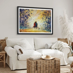 Poster in einem schwarzem Rahmen - Ein Paar sitzt auf einer Bank zwischen herbstlichen Bäumen im Sonnenlicht - 100x70cm - Magischer Augenblick - Moderne Wanddekoration für Wohnzimmer und Schlafzimmer ARTTOR