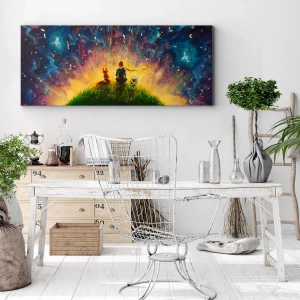 Die Leinwand wird über den Rahmen gespannt. Die Seiten und Kanten werden gedruckt, um das Bild fortzusetzen. Das Bild ist fertig zum Aufhängen an der Wand. Jedes Produkt hat einen am Rahmen befestigten Anhänger und ein Montageset (Schraube + Stift).