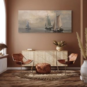 Bild auf Leinwand - Leinwandbild - Segelboote auf ruhigem Meer in pastellfarbener Umgebung - 140x50cm - Die Rückkehr der Matrosen - Moderne Wanddekoration für Wohnzimmer und Schlafzimmer ARTTOR