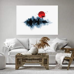 Poster - Rote Sonne über einer malerischen Landschaft mit Torii - 100x70cm - Japanische Sicht - Moderne Wanddekoration für Wohnzimmer und Schlafzimmer ARTTOR