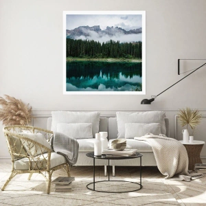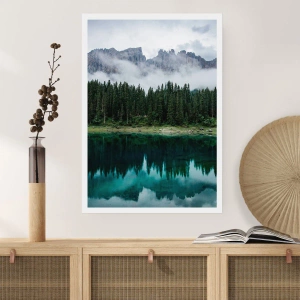 Poster - Eine Berglandschaft mit einem Wald und einem See, in dem sich der Himmel spiegelt - 100x70cm - Leise, leise, lass uns das Trinkwasser nicht wecken ... - Moderne Wanddekoration für Wohnzimmer und Schlafzimmer ARTTOR